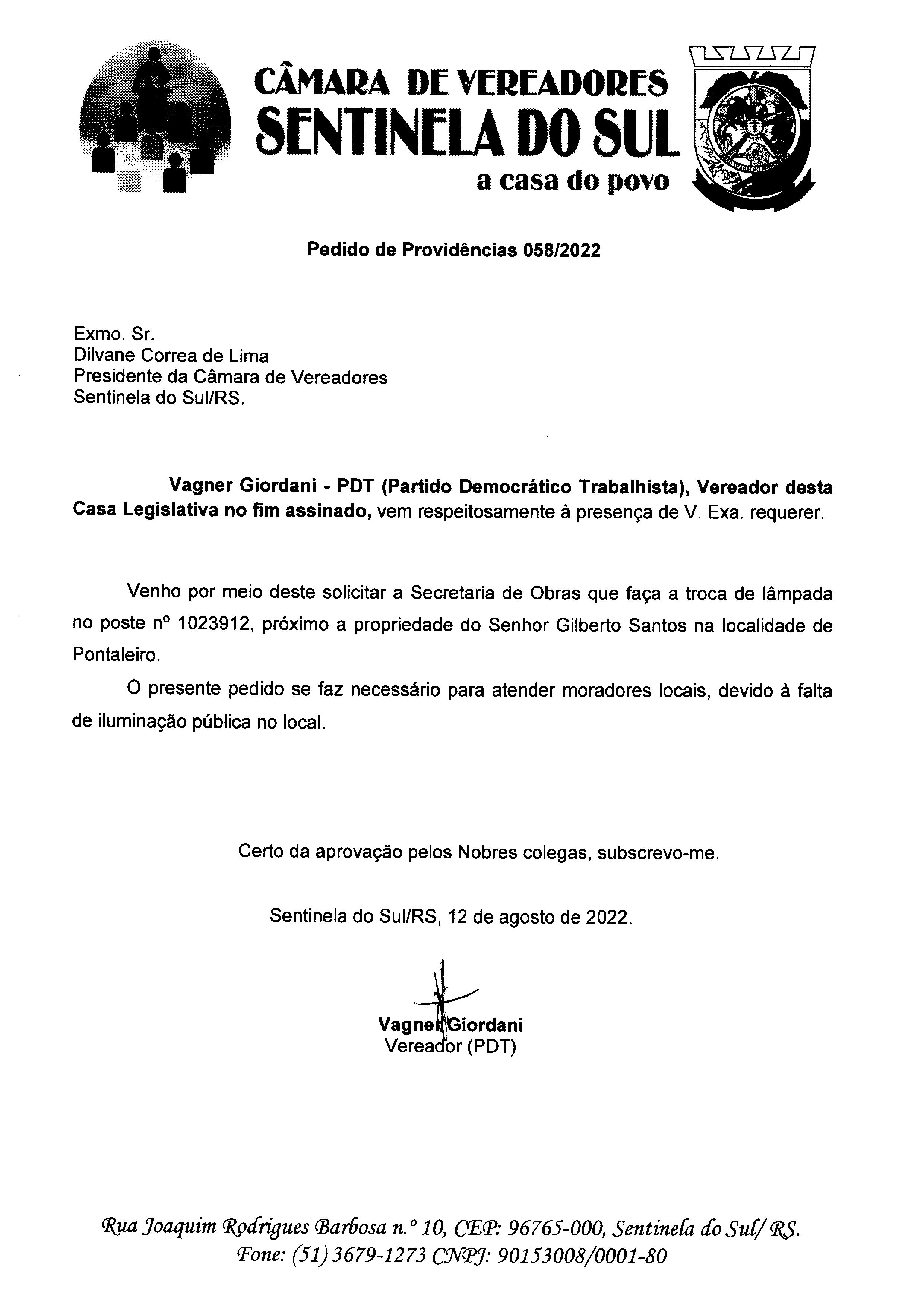 PEDIDO DE PROVIDÊNCIAS Nº 058/2022