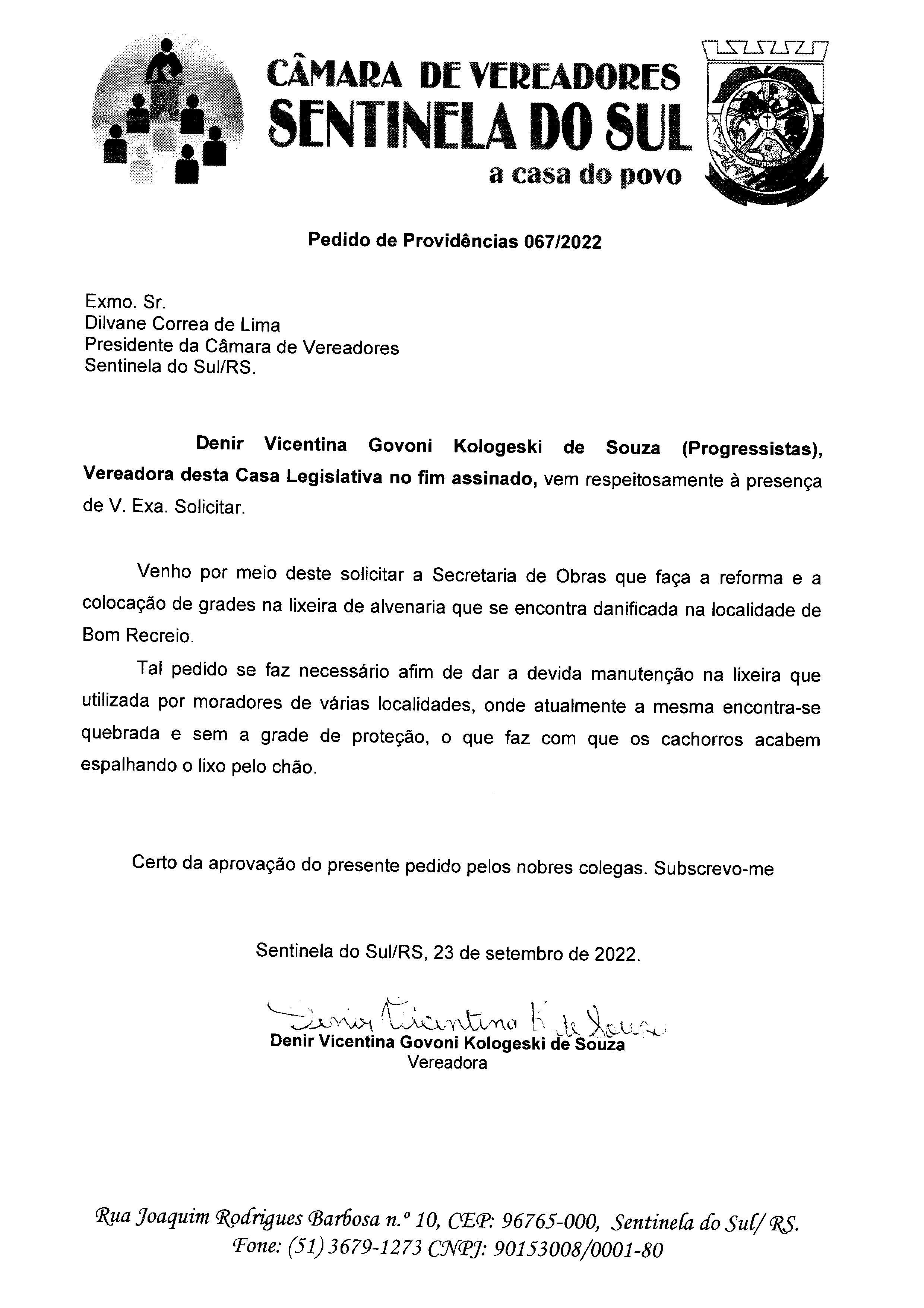 Pedido de Providências de autoria da Vereadora Denir Vicentina Govoni Kologeski de Souza