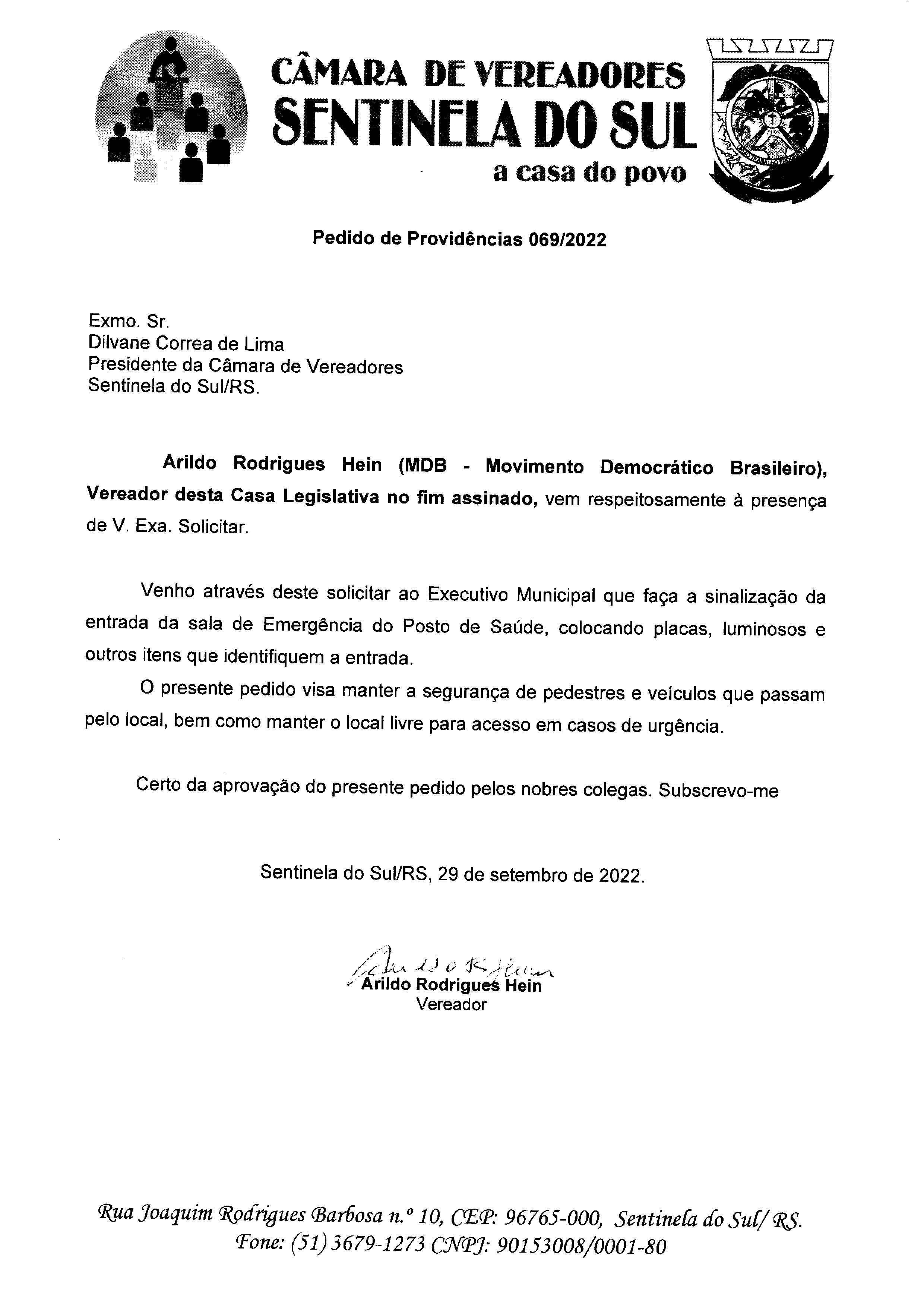 PEDIDO DE PROVIDÊNCIAS Nº 069/2022