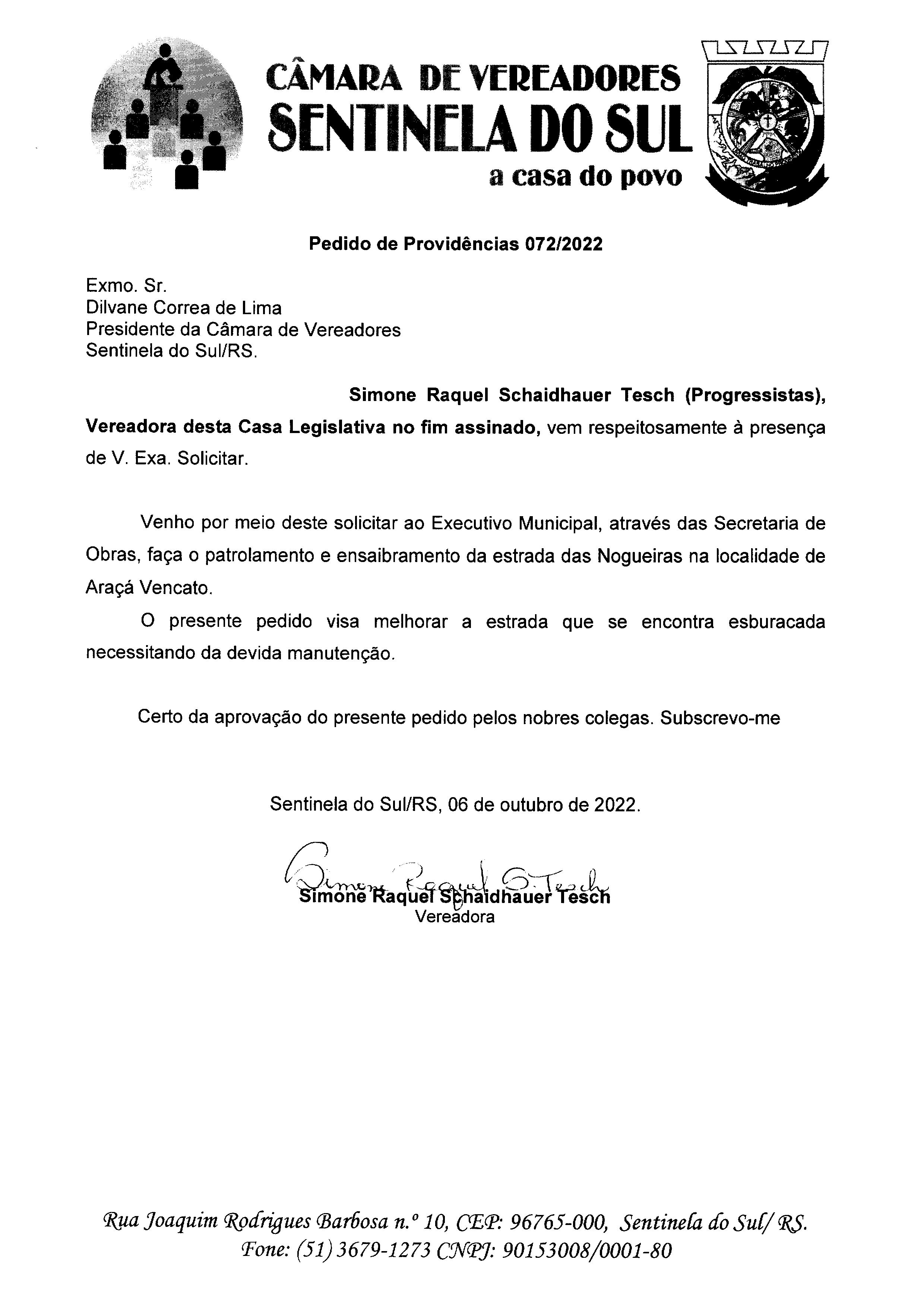 PEDIDO DE PROVIDÊNCIAS Nº 072/2022