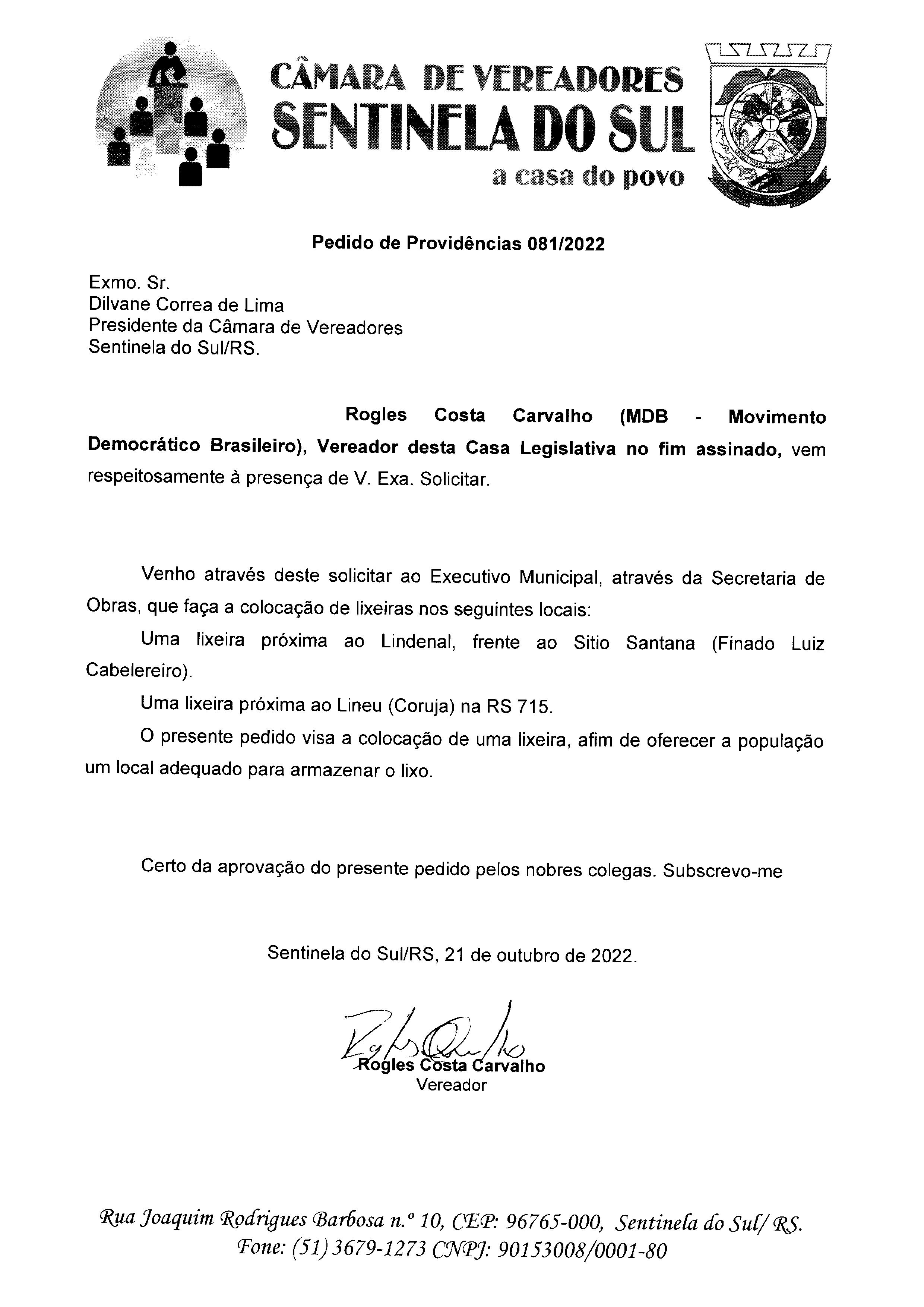 Pedido de Providências de autoria do Vereador Rogles Costa Carvalho