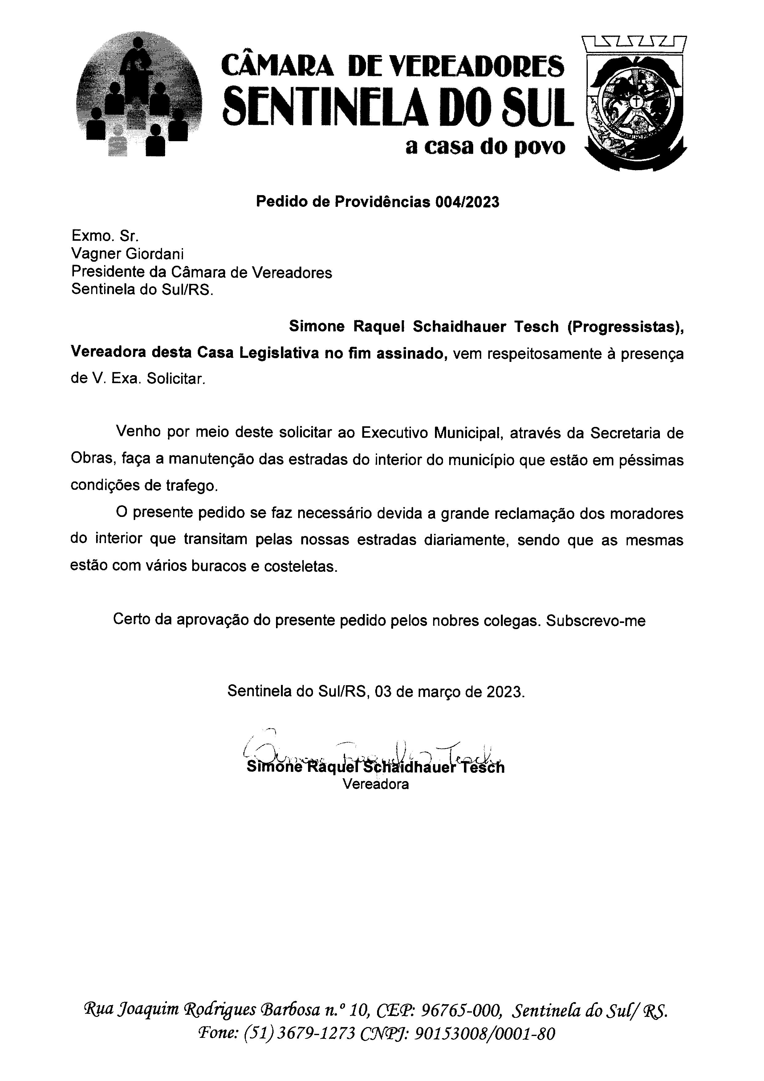 Pedido de Providências de autoria da Vereadora Simone Raquel Schaidhauer Tesch