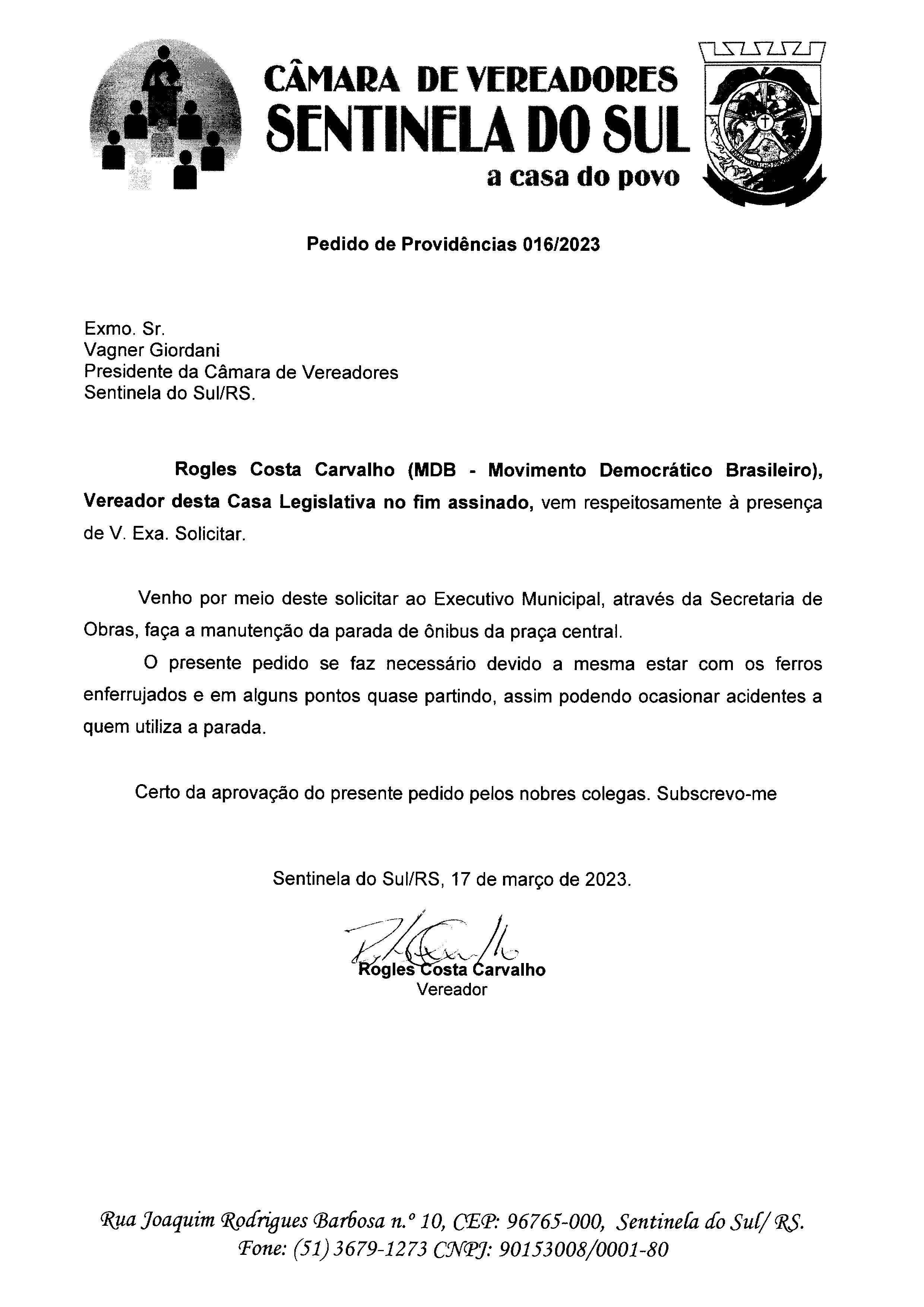Pedido de Providências de autoria do Vereador Rogles Costa Carvalho