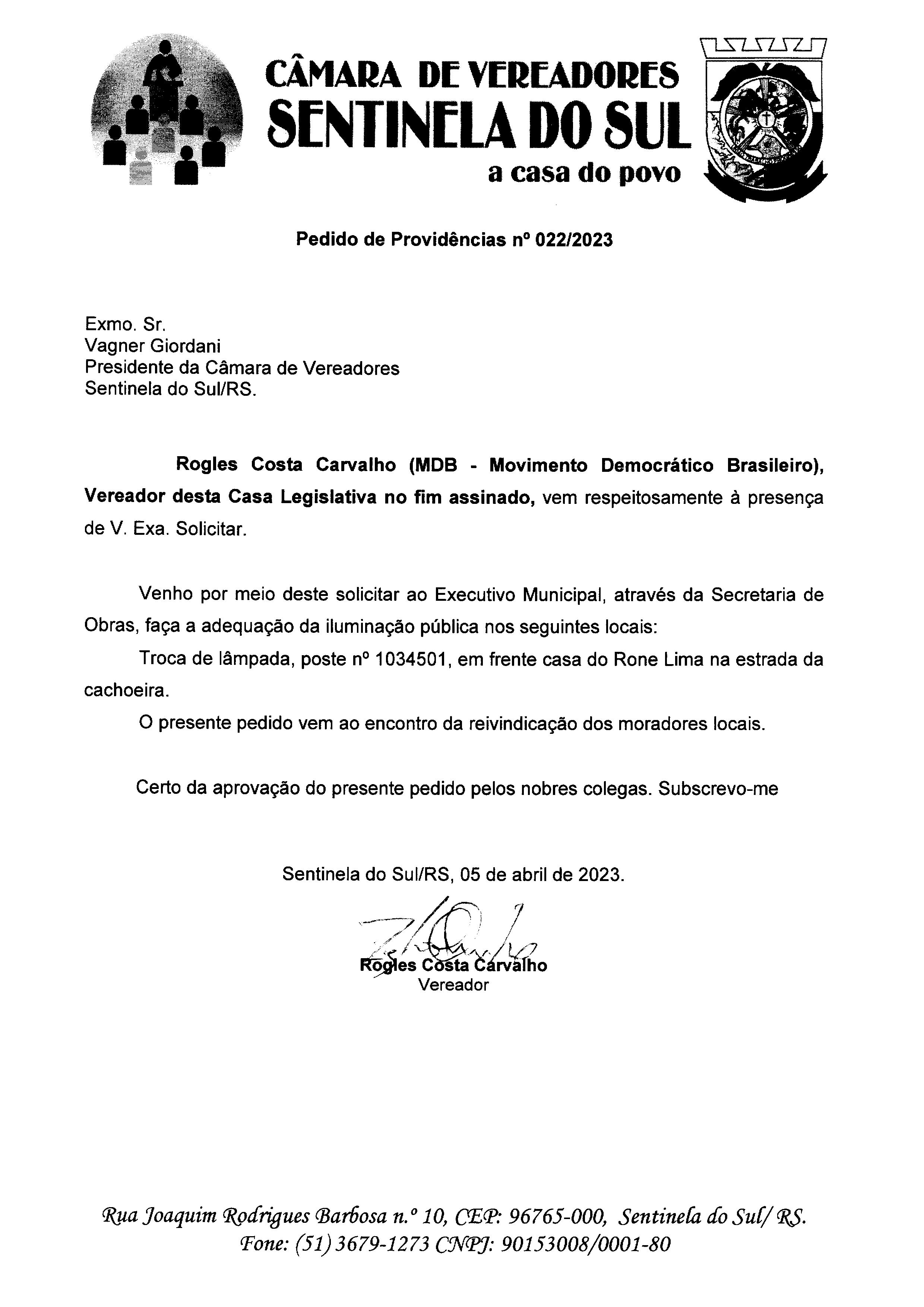 Pedido de Providências de autoria do Vereador Rogles Costa Carvalho