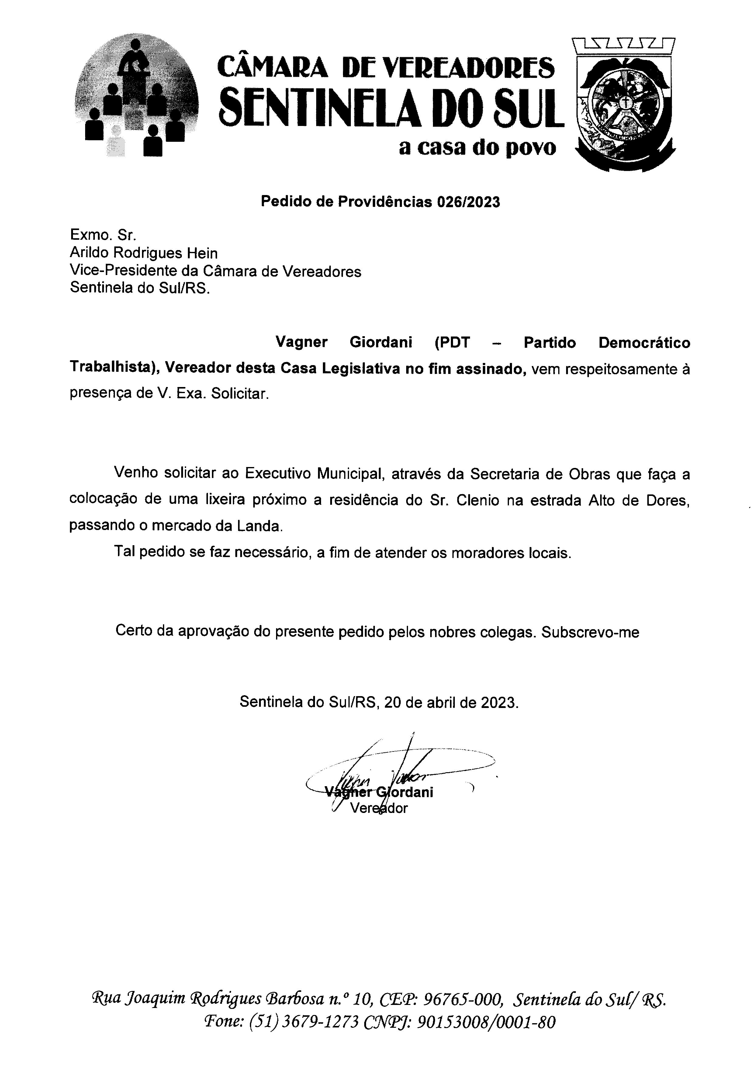 Pedido de Providências de autoria do Vereador Vagner Giordani