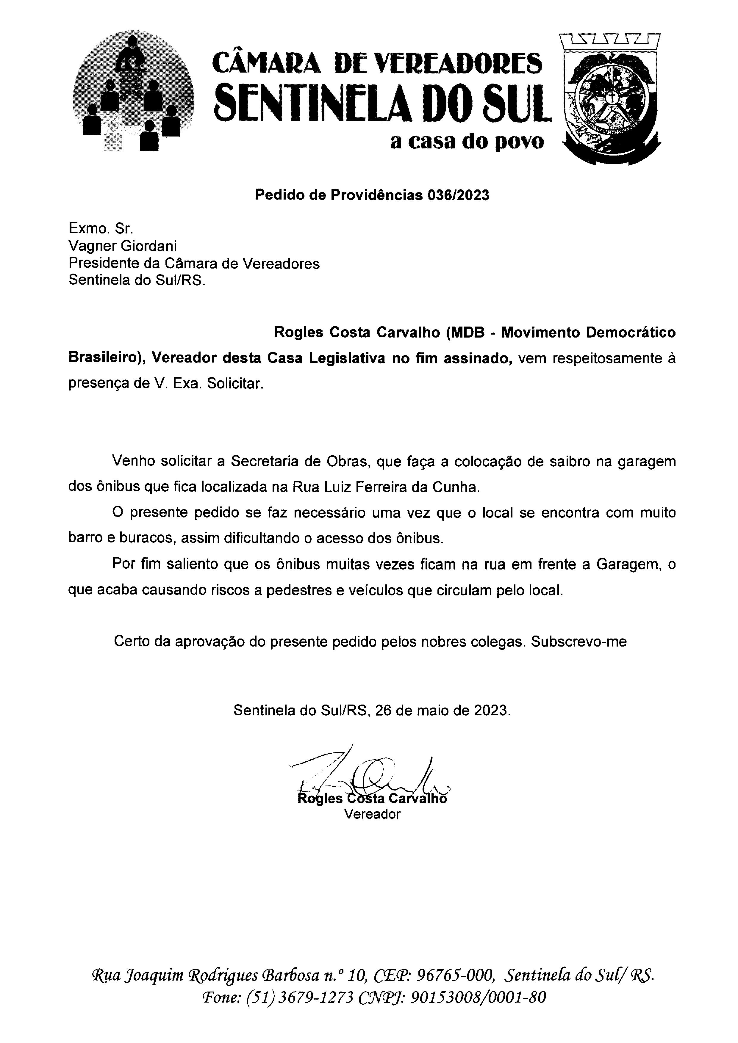 Pedido de providências de autoria do vereador Rogles Costa Carvalho