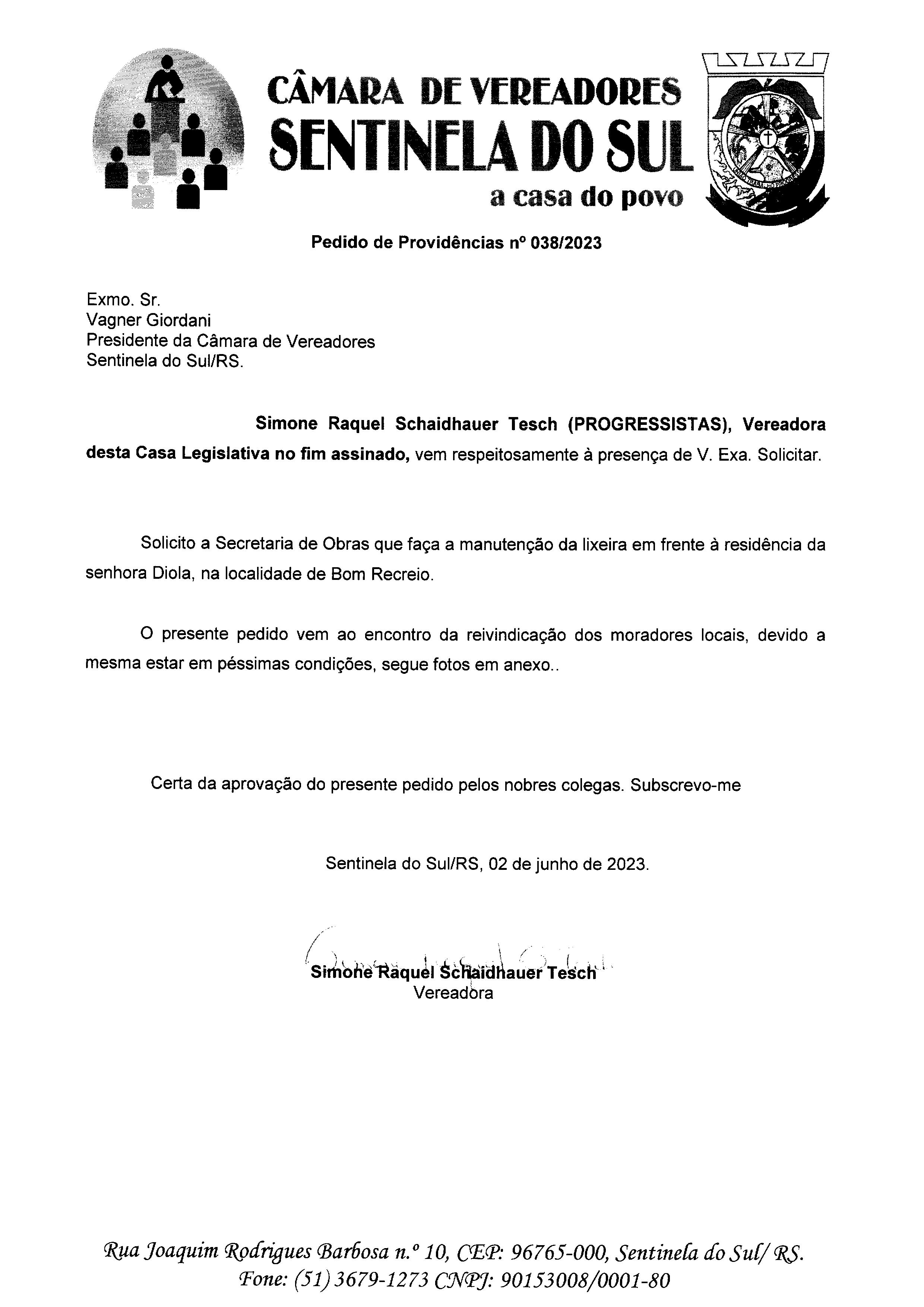 Pedido de Providências de autoria da Vereadora Simone Raquel Schaidhauer Tesch