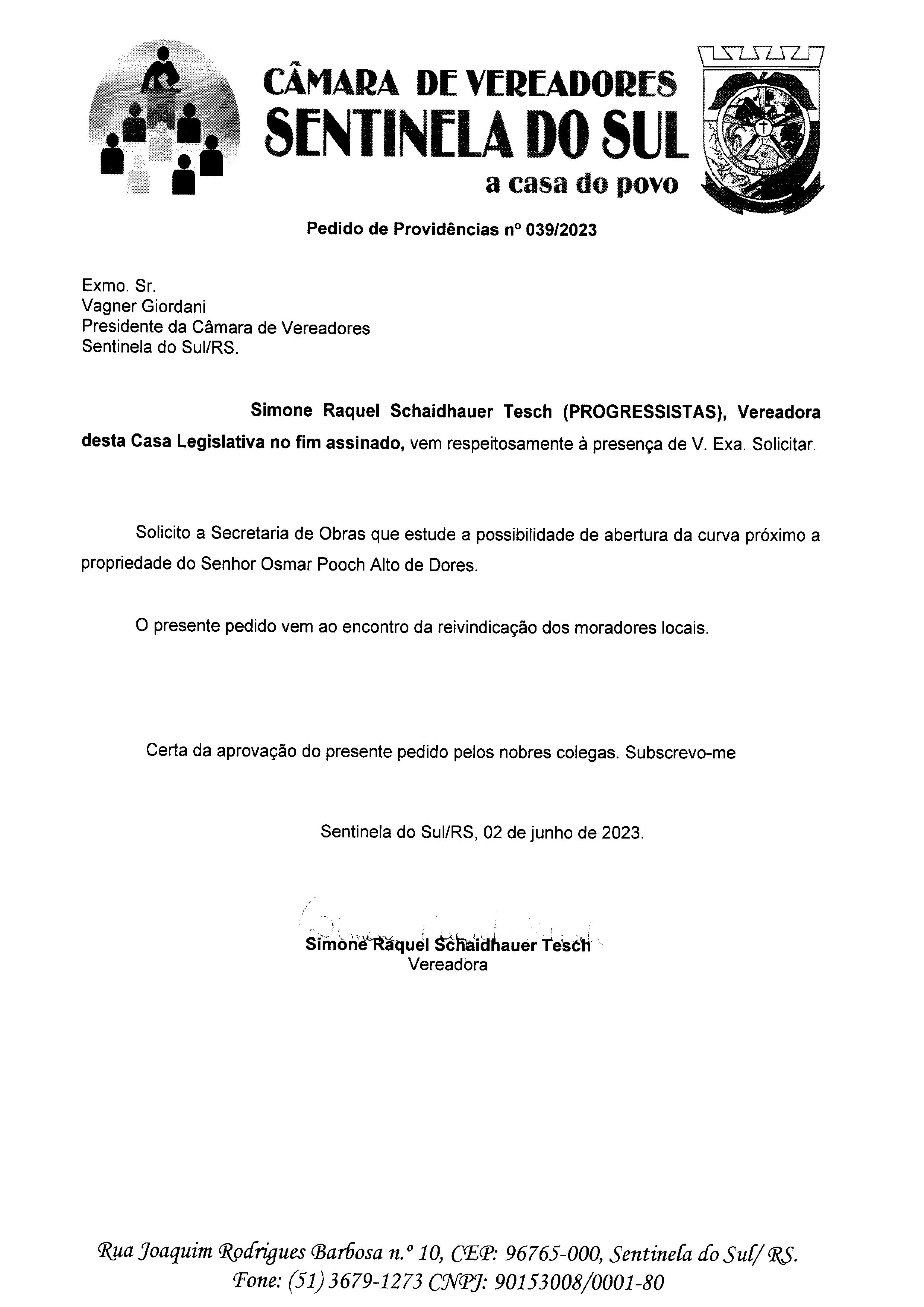 Pedido de Providências de autoria da Vereadora Simone Raquel Schaidhauer Tesch