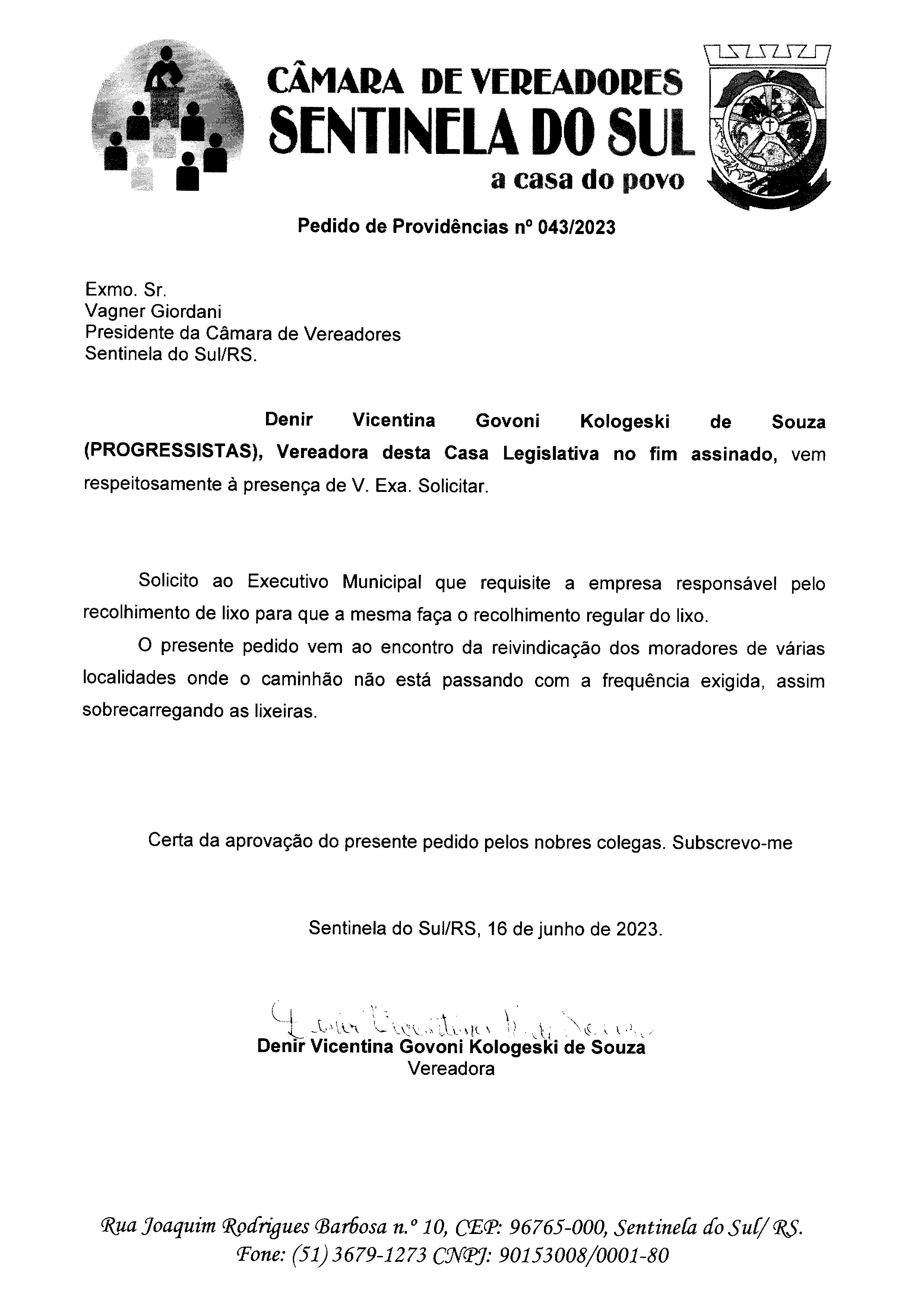 Pedido de Providências de autoria da Vereadora Denir Vicentina Govoni Kologeski de Souza