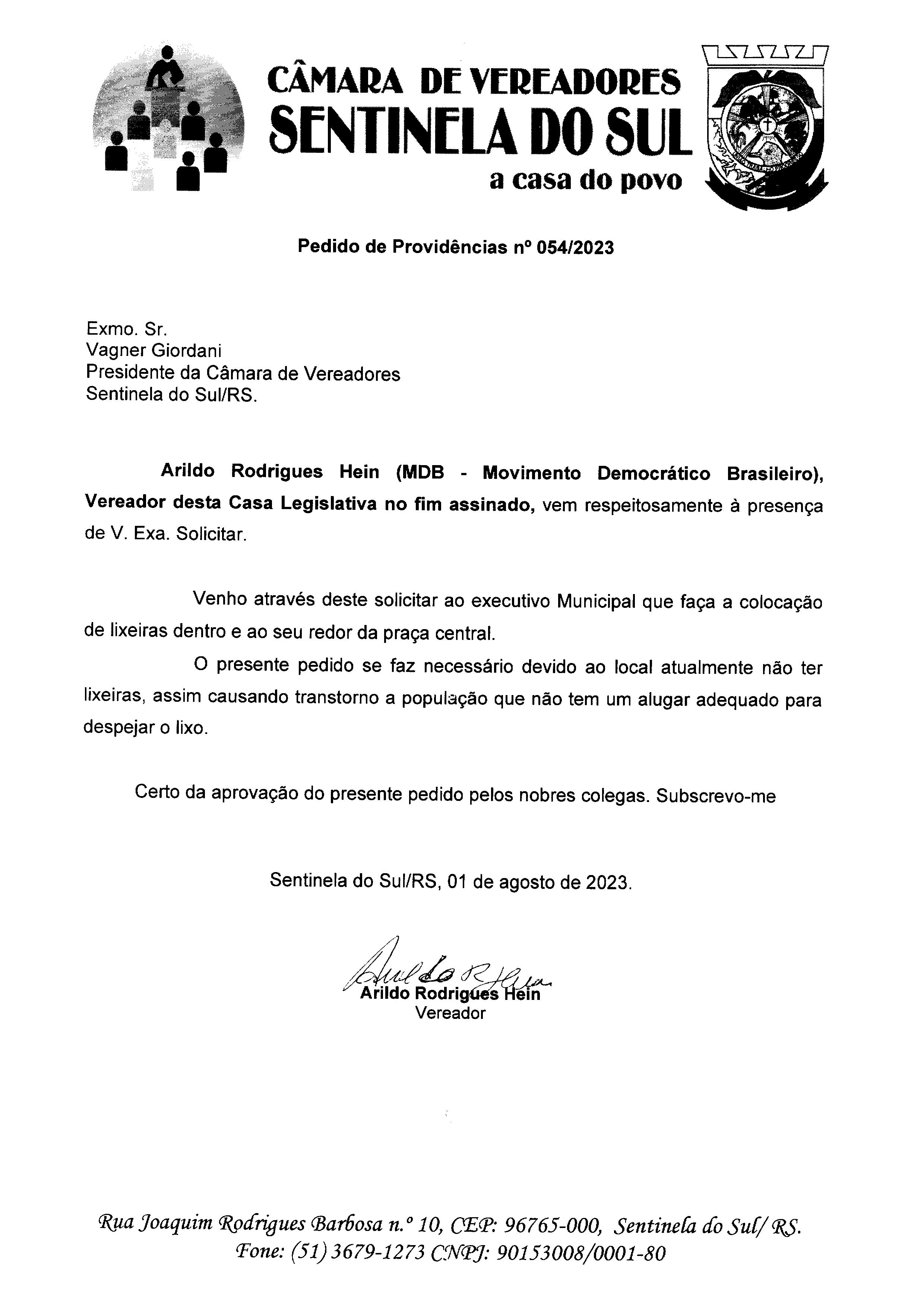 Pedido de providências de autoria do Vereador Arildo Rodrigues Hein
