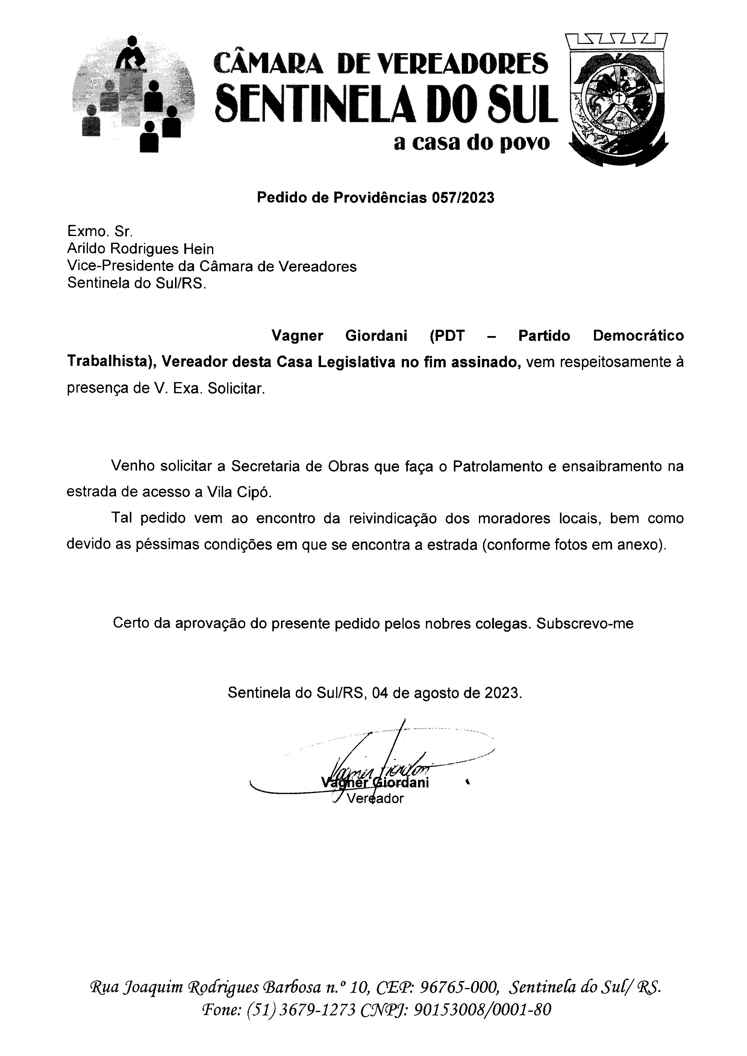 Pedido de Providências de autoria do Vereador Vagner Giordani