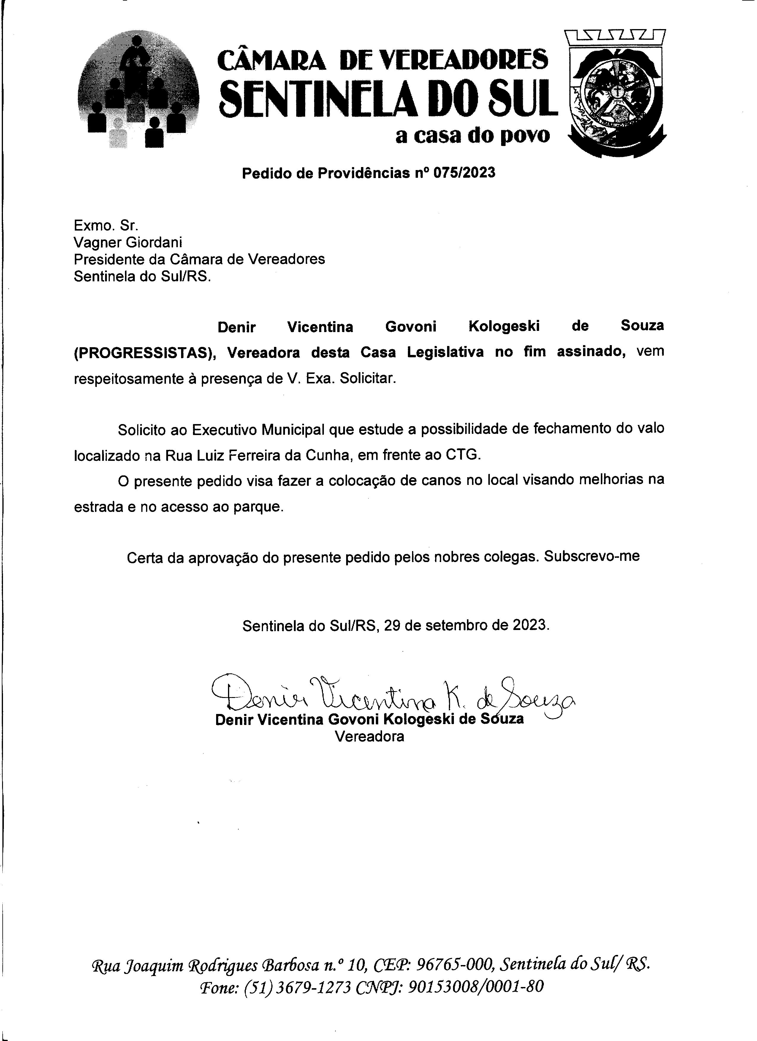 Pedido de Providências de autoria da Vereadora Denir Vicentina Govoni Kologeski de Souza