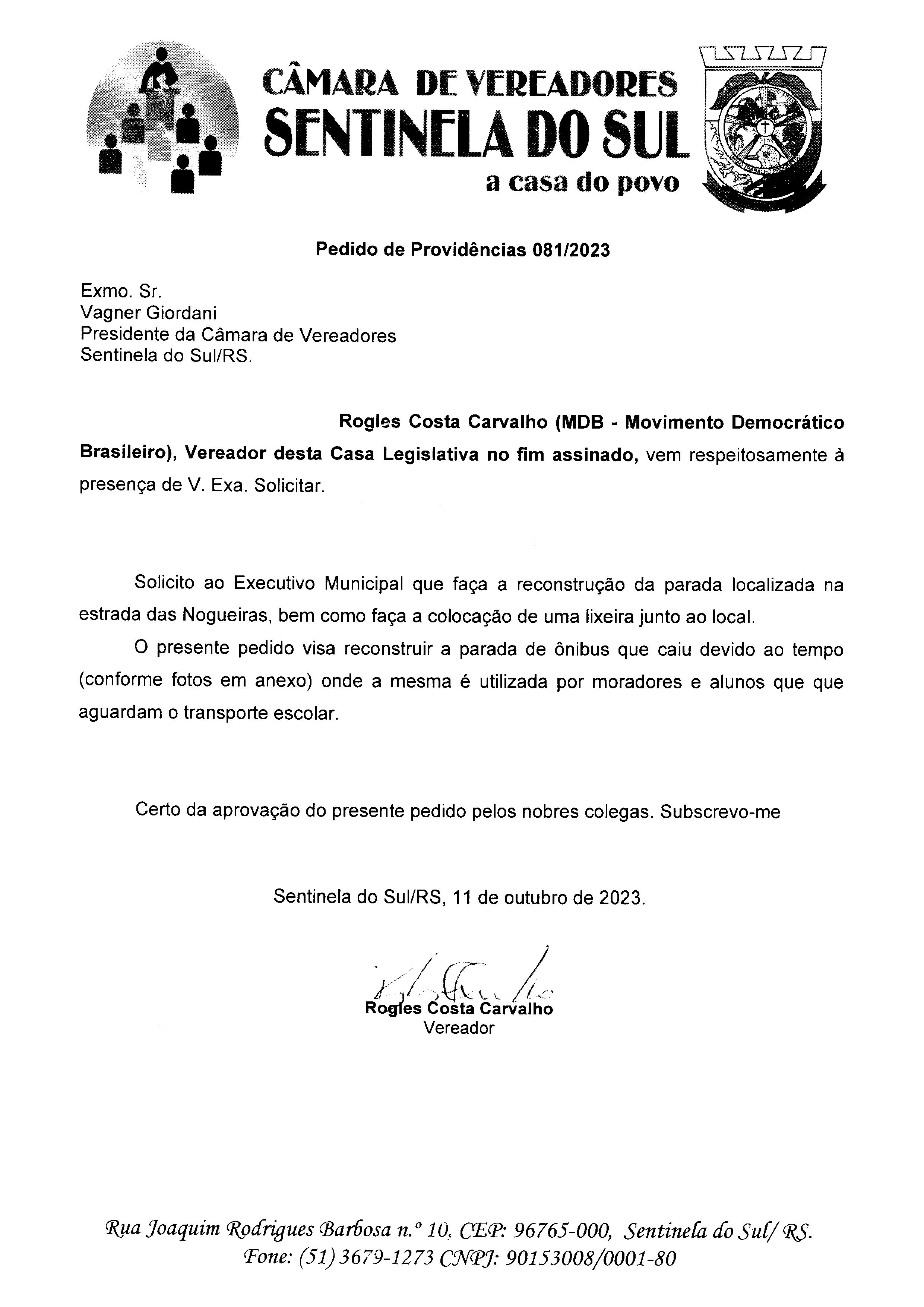 Pedido de Providências de autoria do Vereador Rogles Costa Carvalho