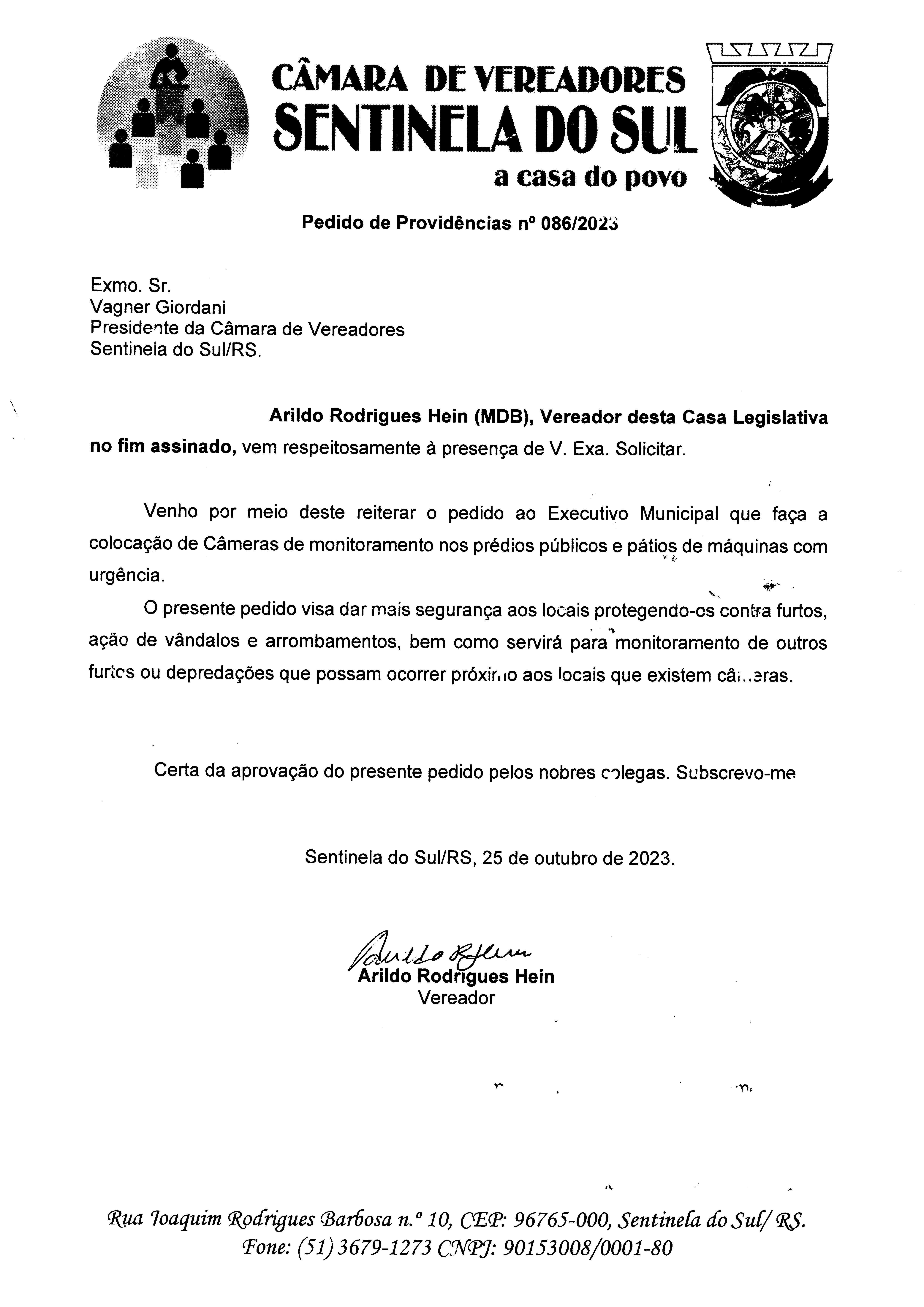 Pedido de providências de autoria do Vereador Arildo Rodrigues Hein