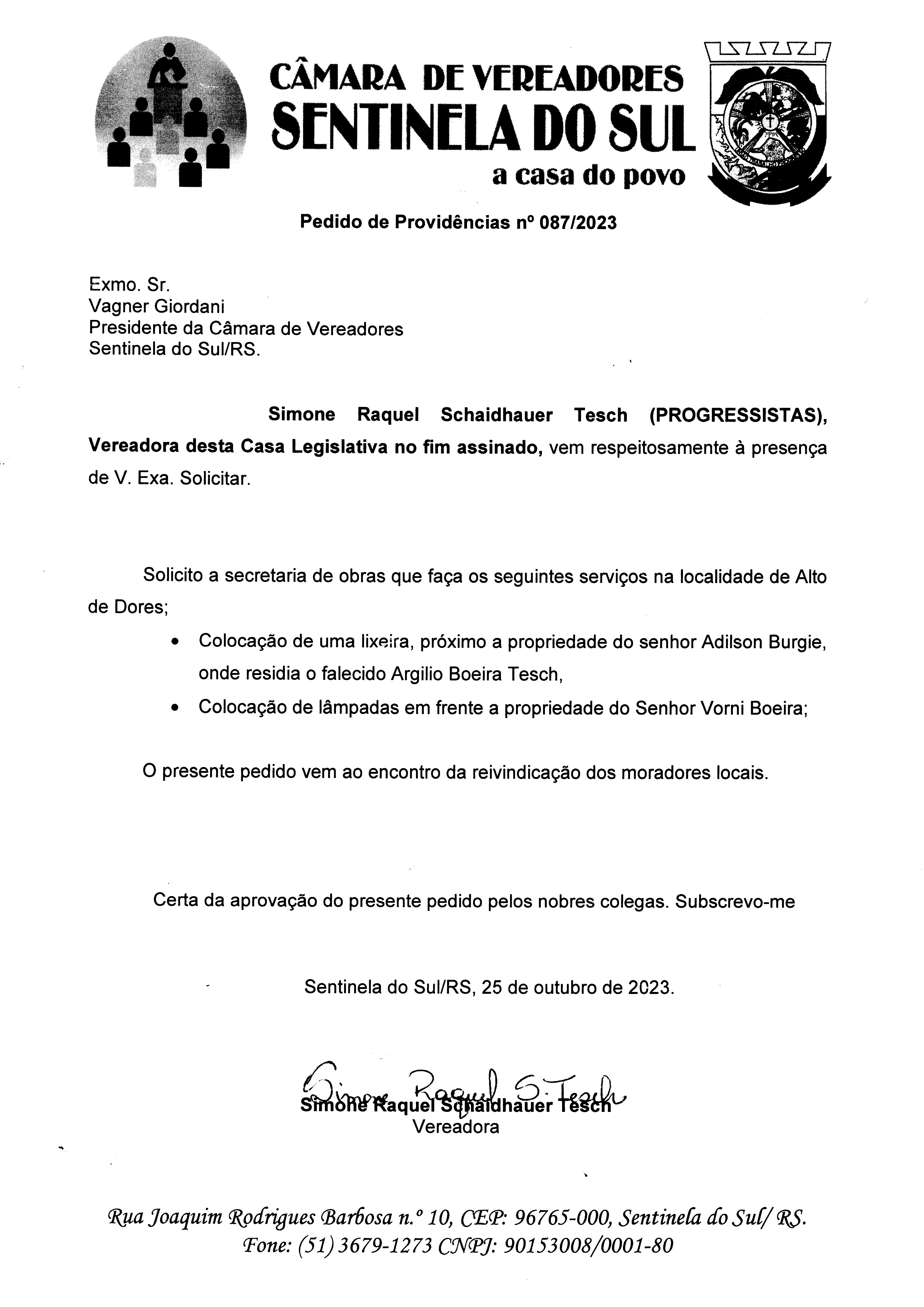 Pedido de Providências de autoria da Vereadora Simone Raquel Schaidhauer Tesch