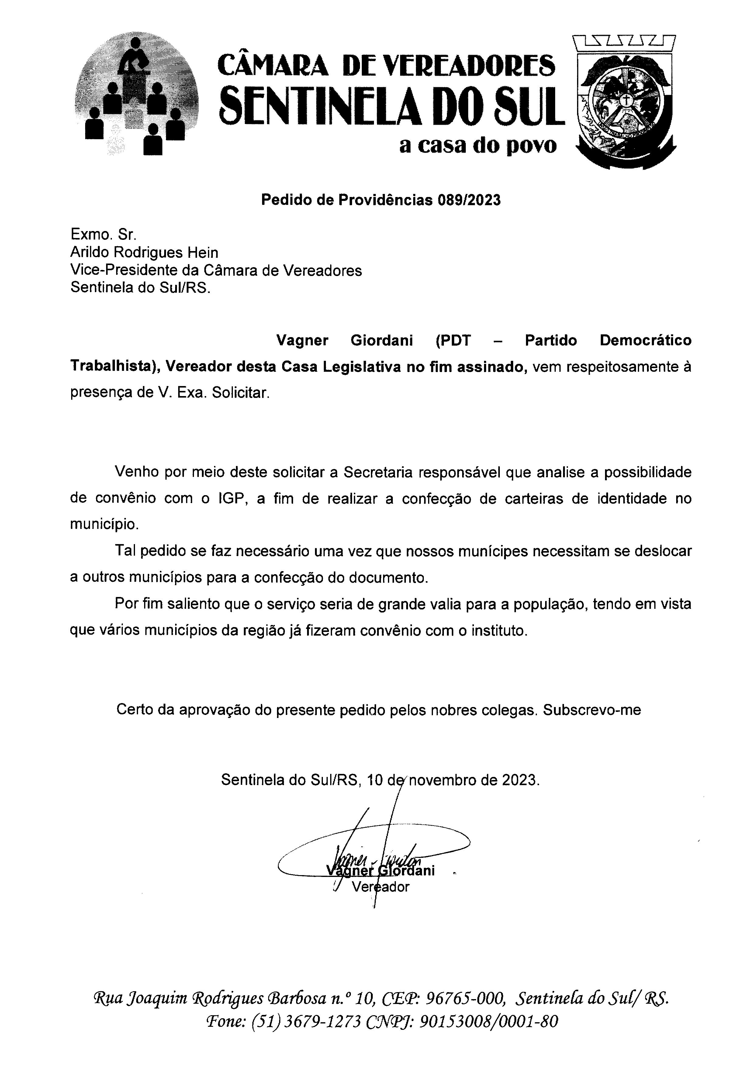 PEDIDO DE PROVIDÊNCIAS Nº 089/2023
