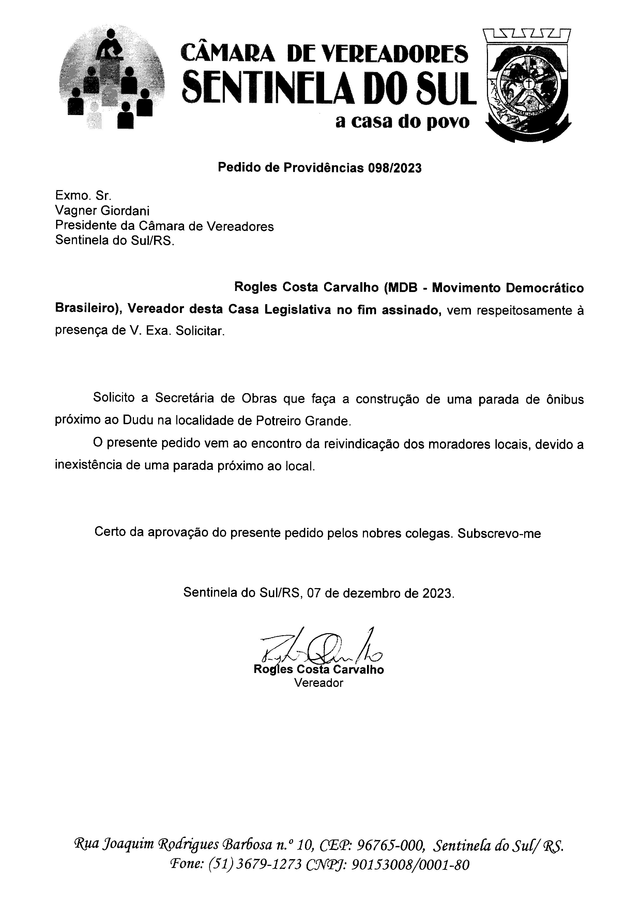 Pedido de providências de autoria do vereador Rogles Costa Carvalho