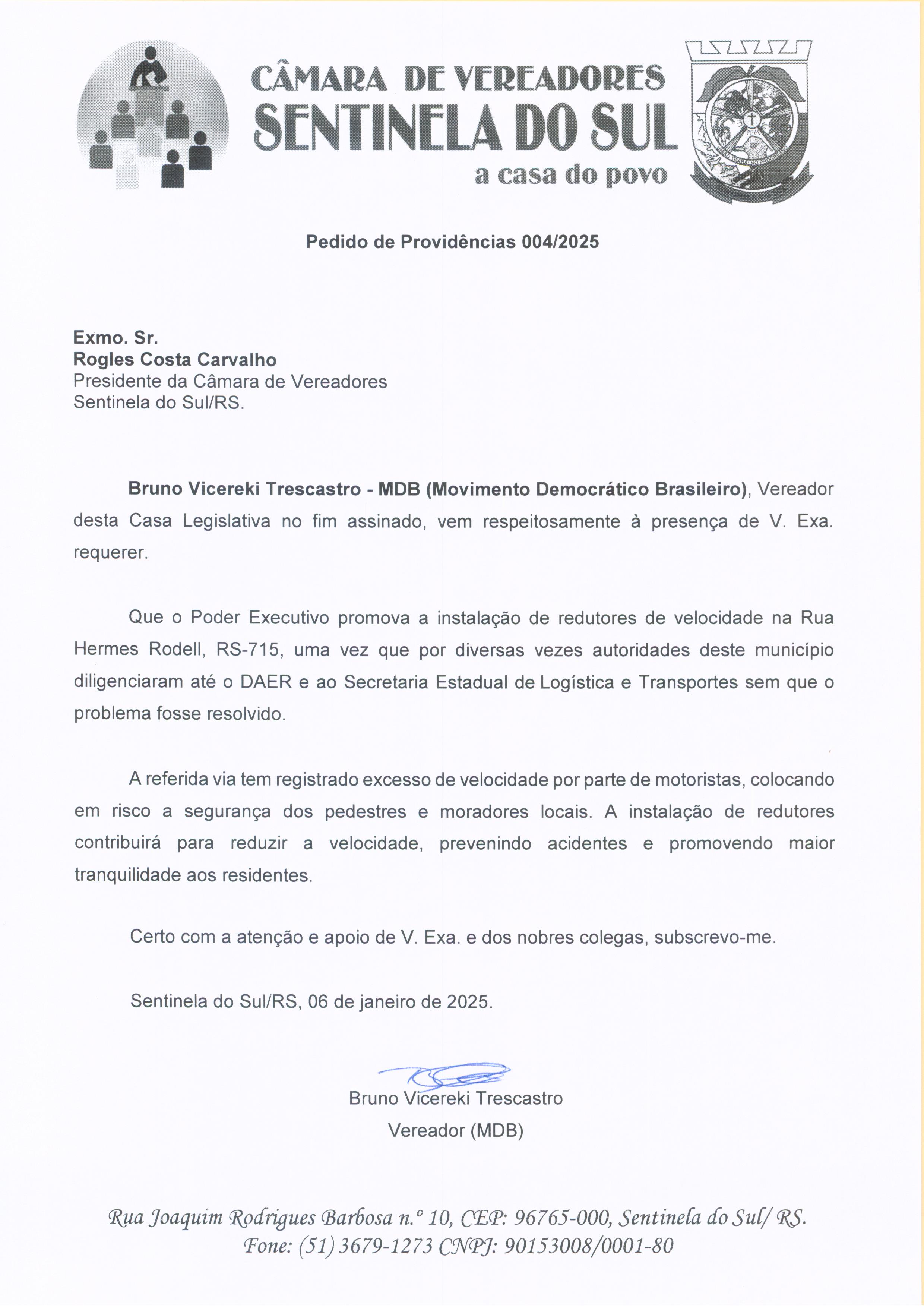 Pedido de Providências de autoria do Vereador Bruno Vicereki Trescastro