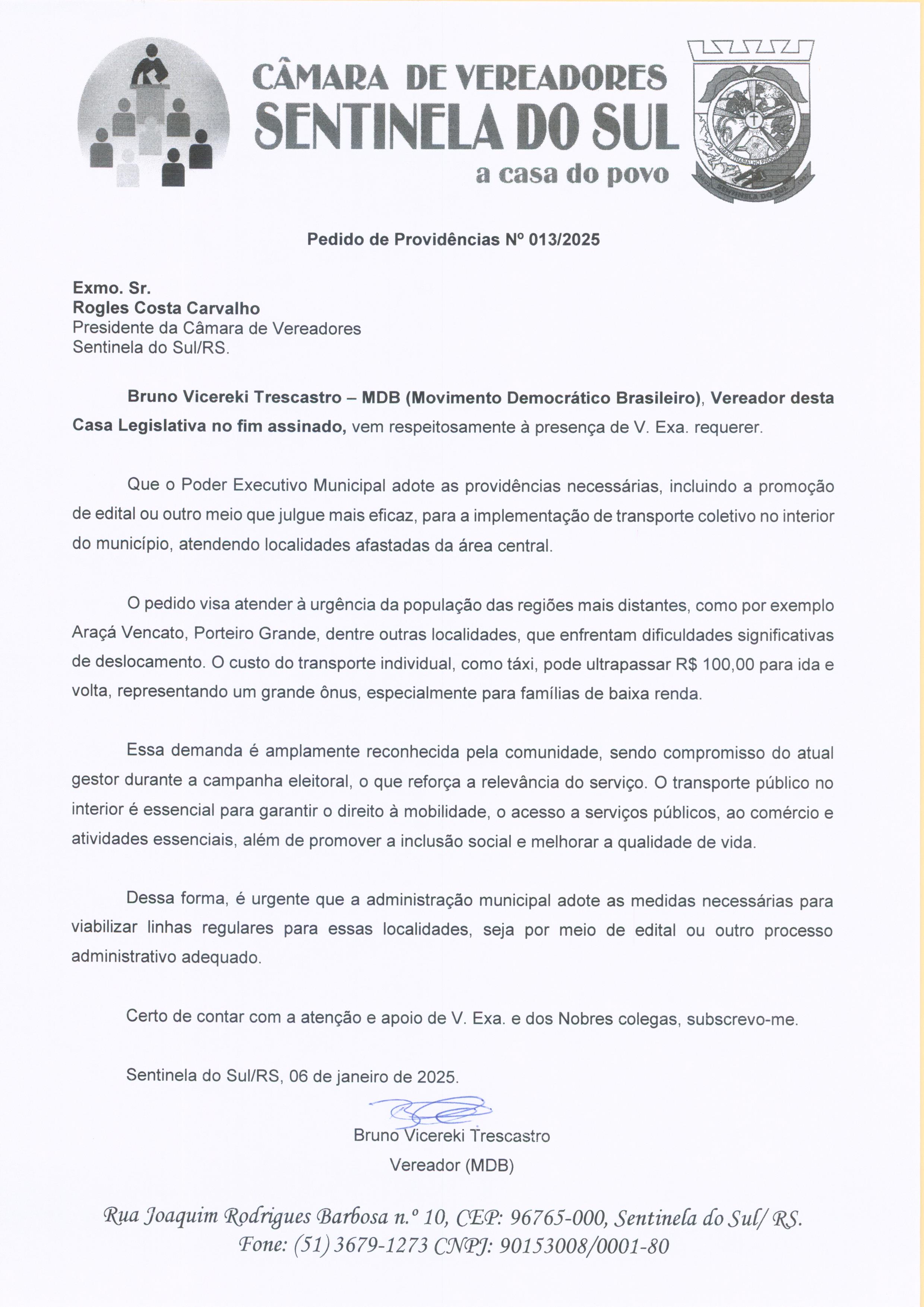 Pedido de Providências de autoria do Vereador Bruno Vicereki Trescastro