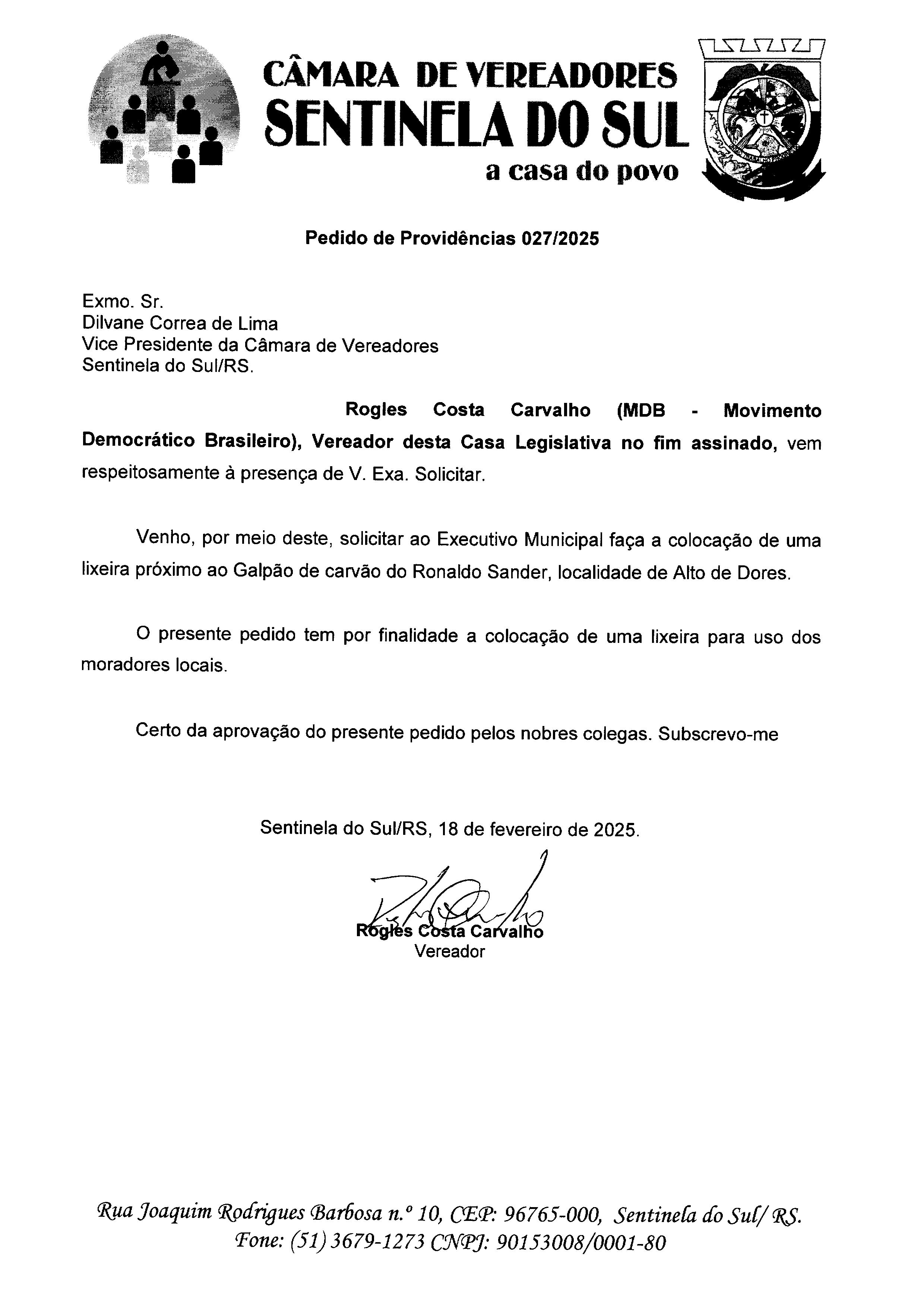 Pedido de Providências de autoria do vereador Rogles Costa Carvalho