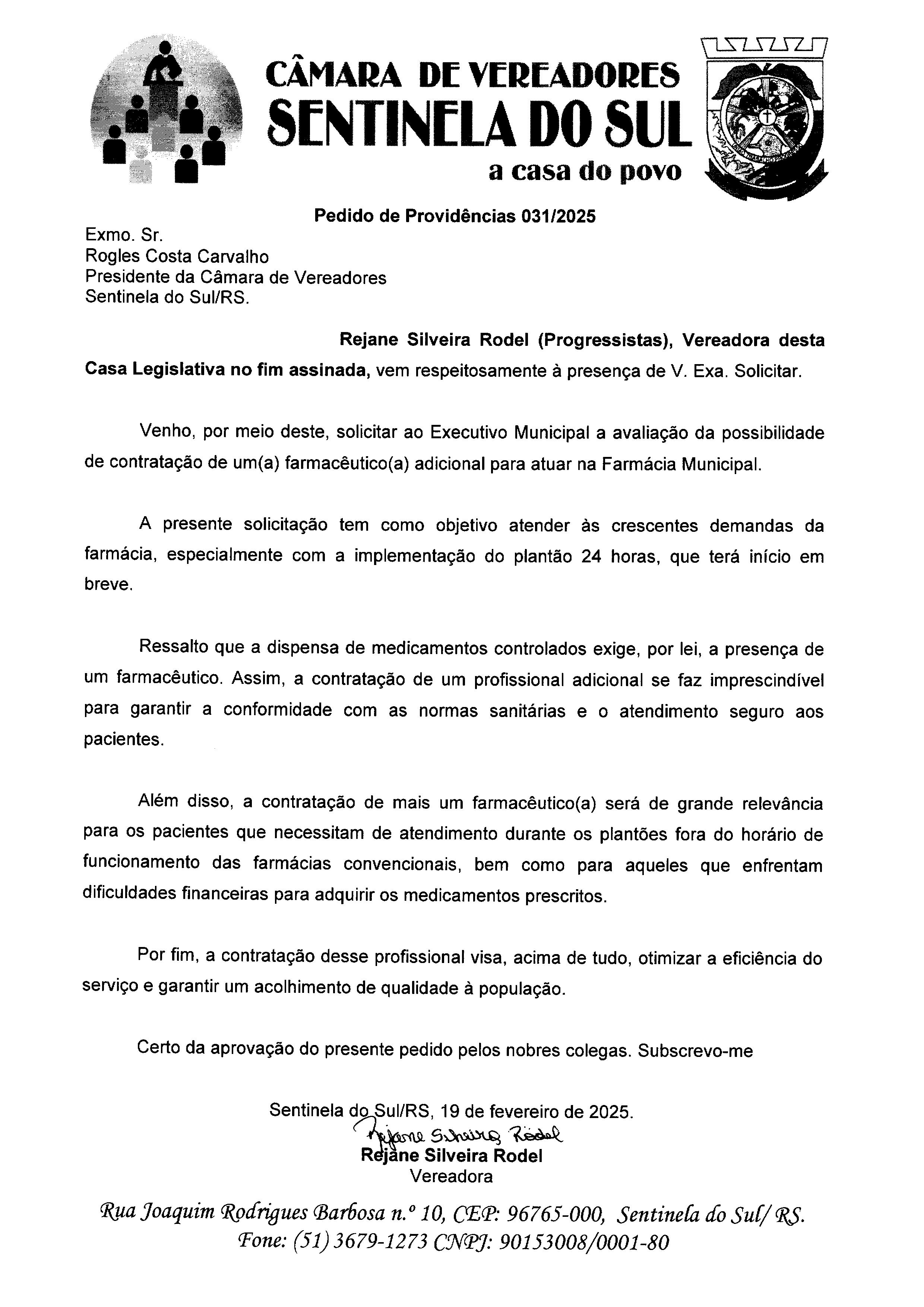 Pedido de Providências de autoria da Vereadora Rejane Silveira Rodel