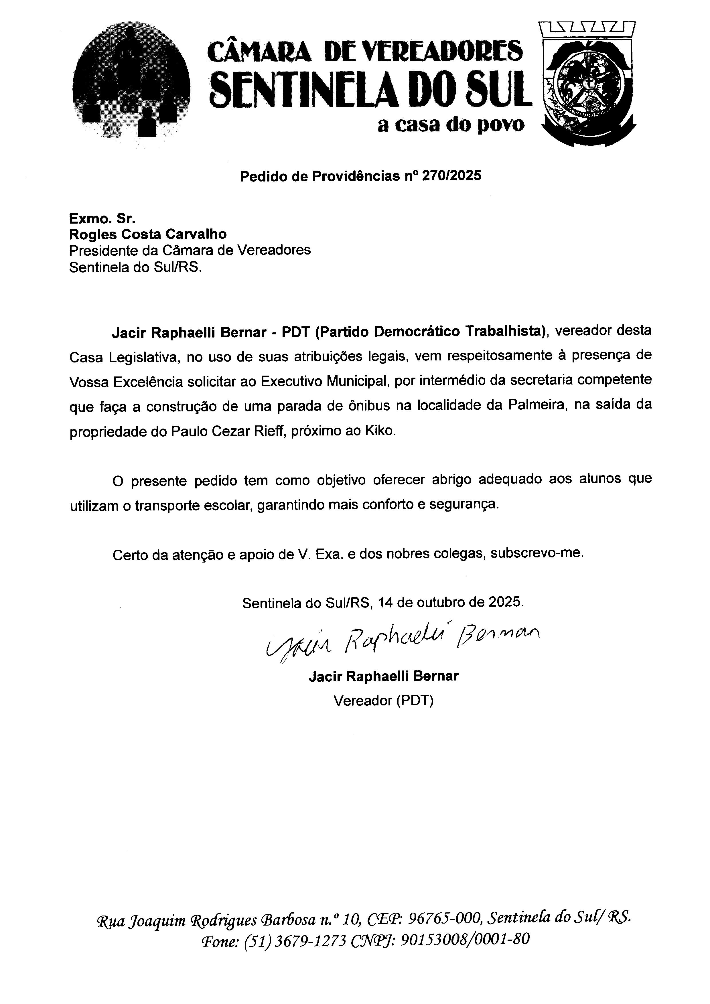 Autoria: Vereador Jacir Raphaelli Bernar -