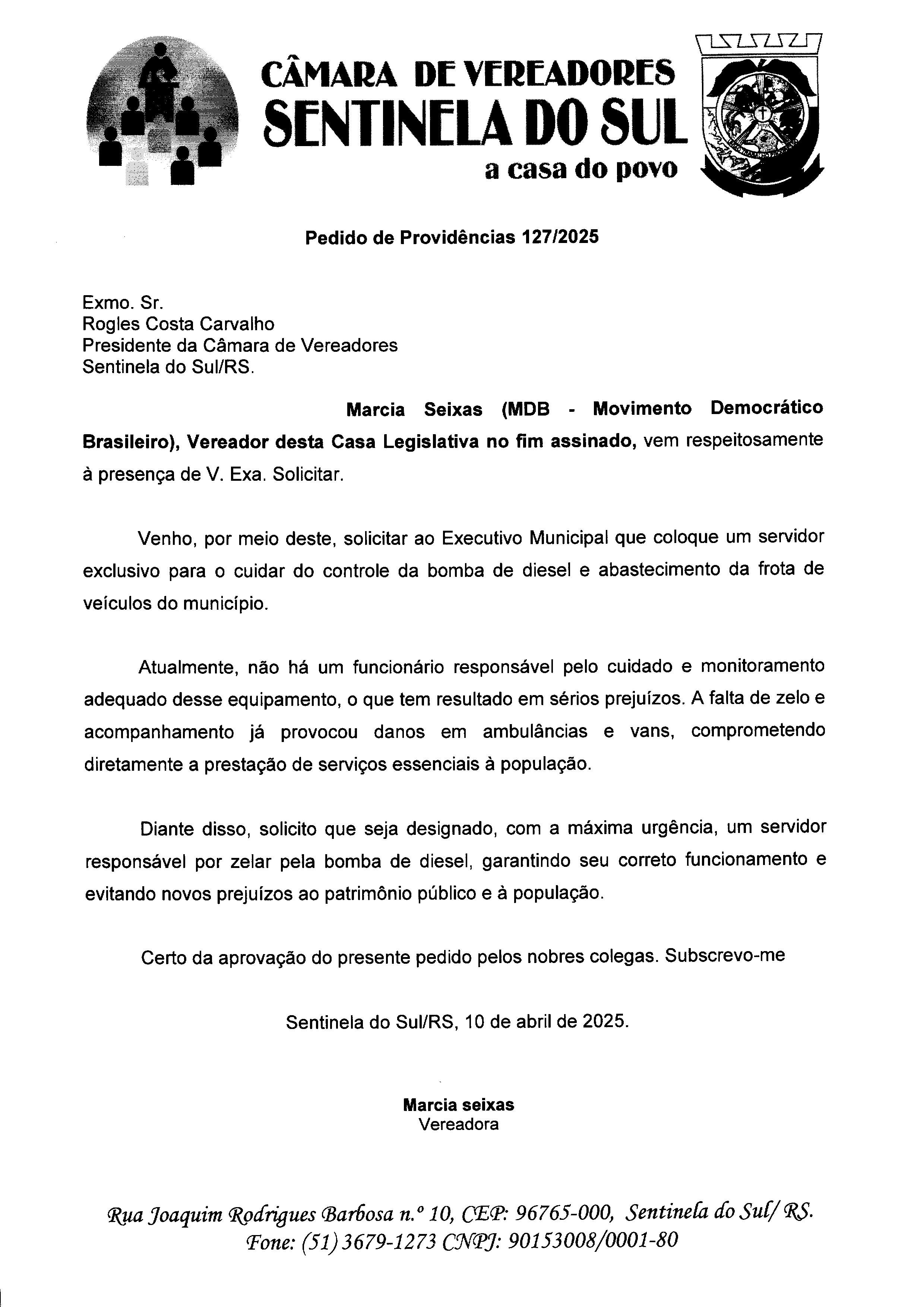 Assunto: Que o executivo coloque um servidor exclusivo para o cuidar do controle da bomba de diesel e abastecimento da frota de veículos do município.