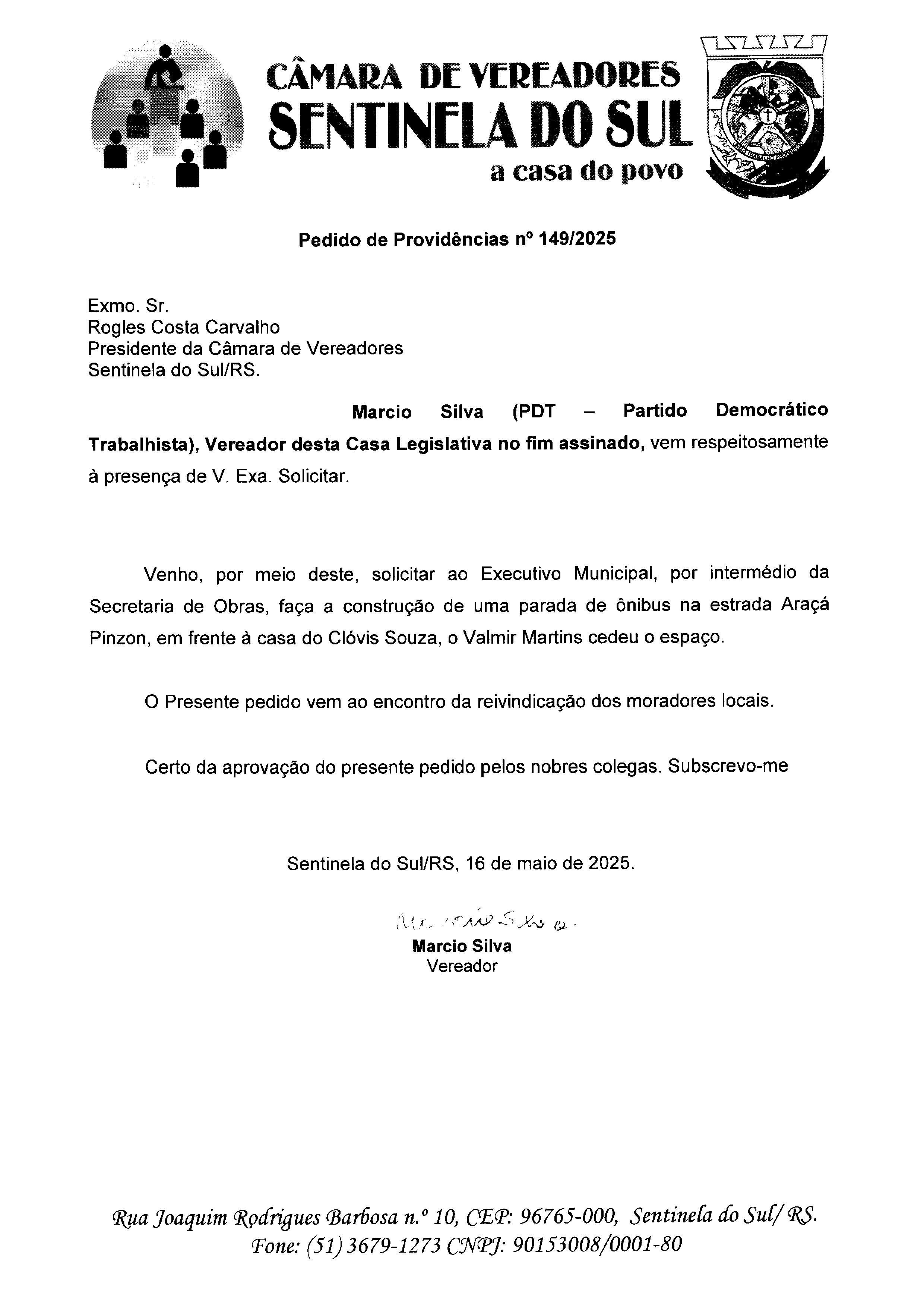 Assunto: Construção de uma parada de ônibus na estrada Araçá Pinzon, em frente à casa do Clóvis Souza