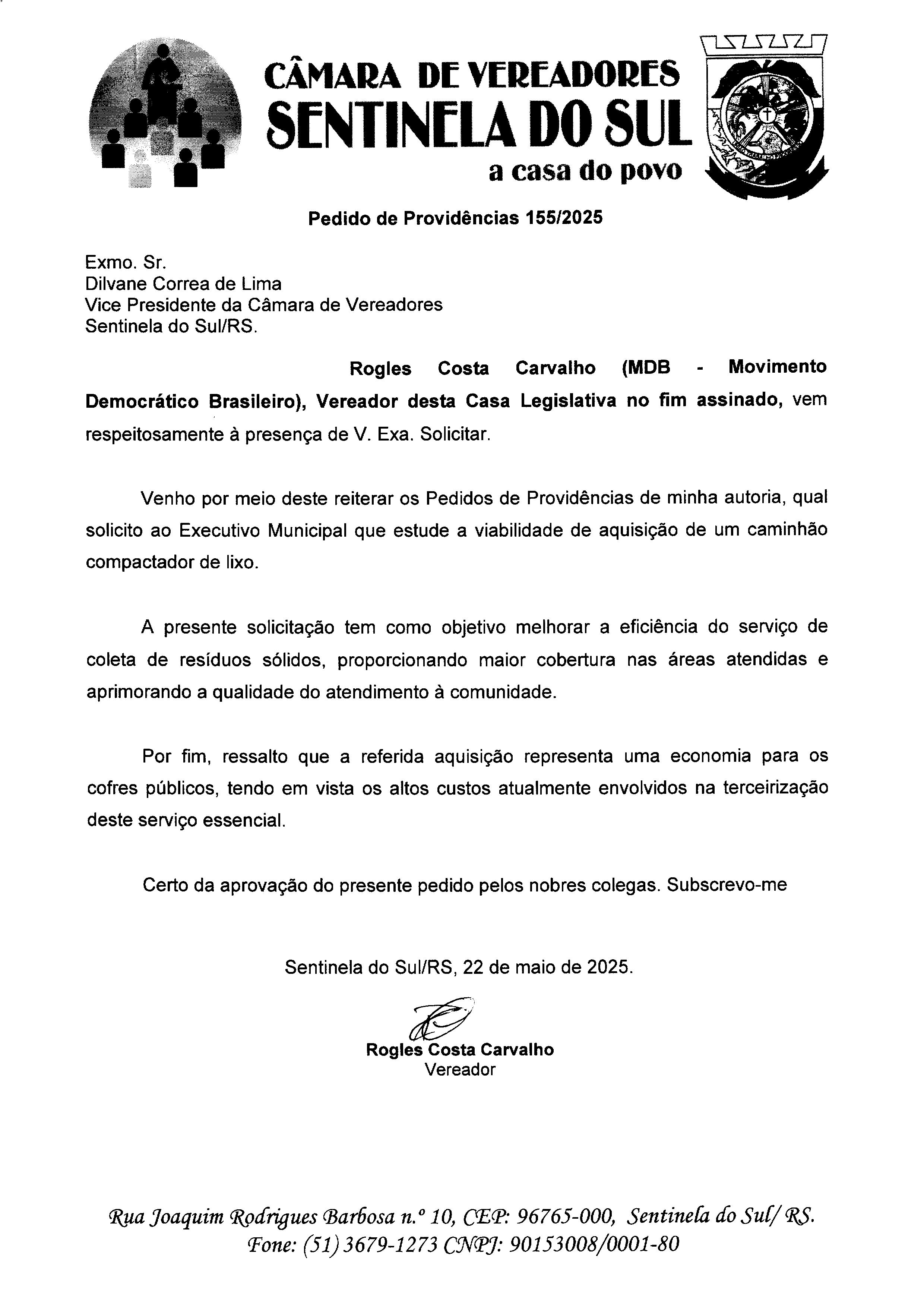 Autoria do Vereador Rogles Costa Carvalho - Assunto - Aquisição de um caminhão compactador de lixo.