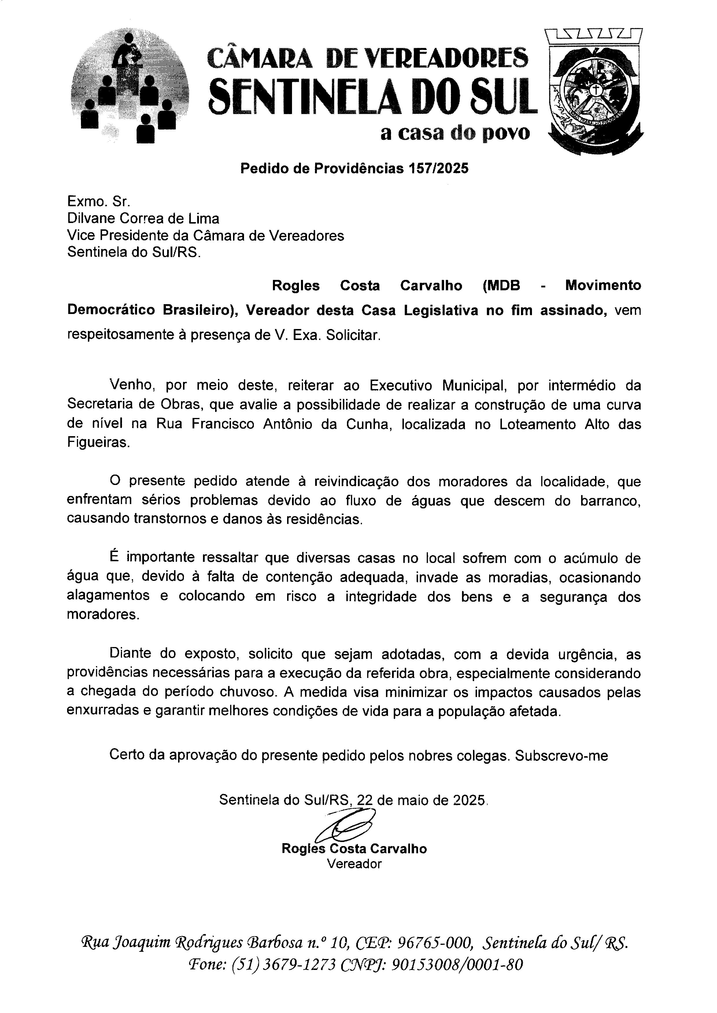 Autoria do Vereador Rogles Costa Carvalho - Assunto - Construção de uma curva de nível na Rua Francisco Antônio da Cunha, localizada no Loteamento Alto das Figueiras.