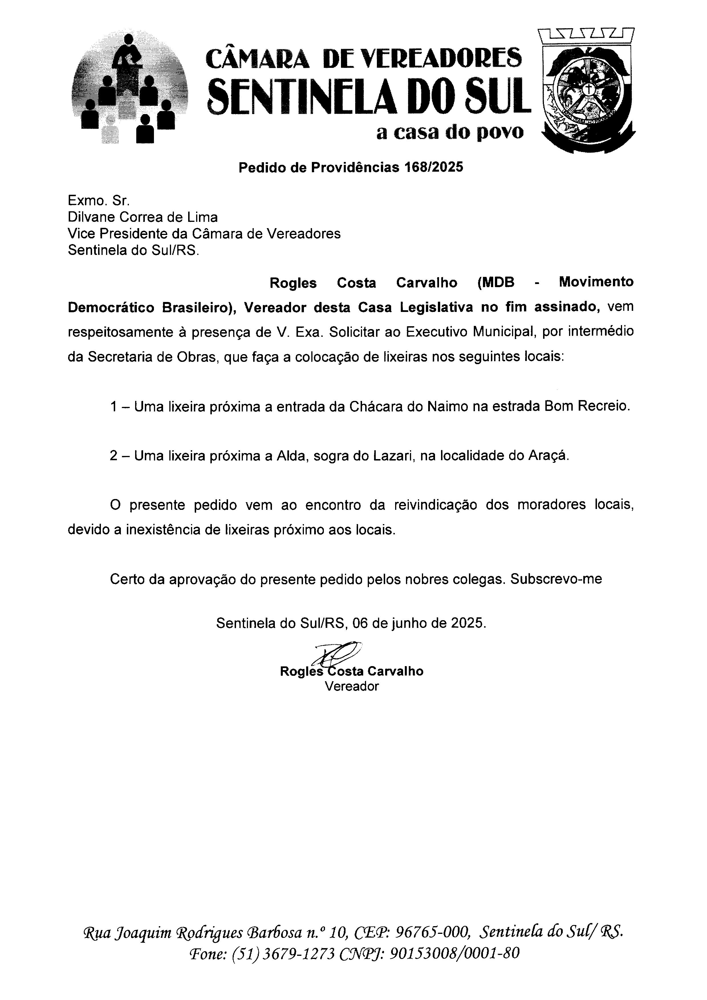 Assunto: Colocação de lixeiras nos seguintes locais: