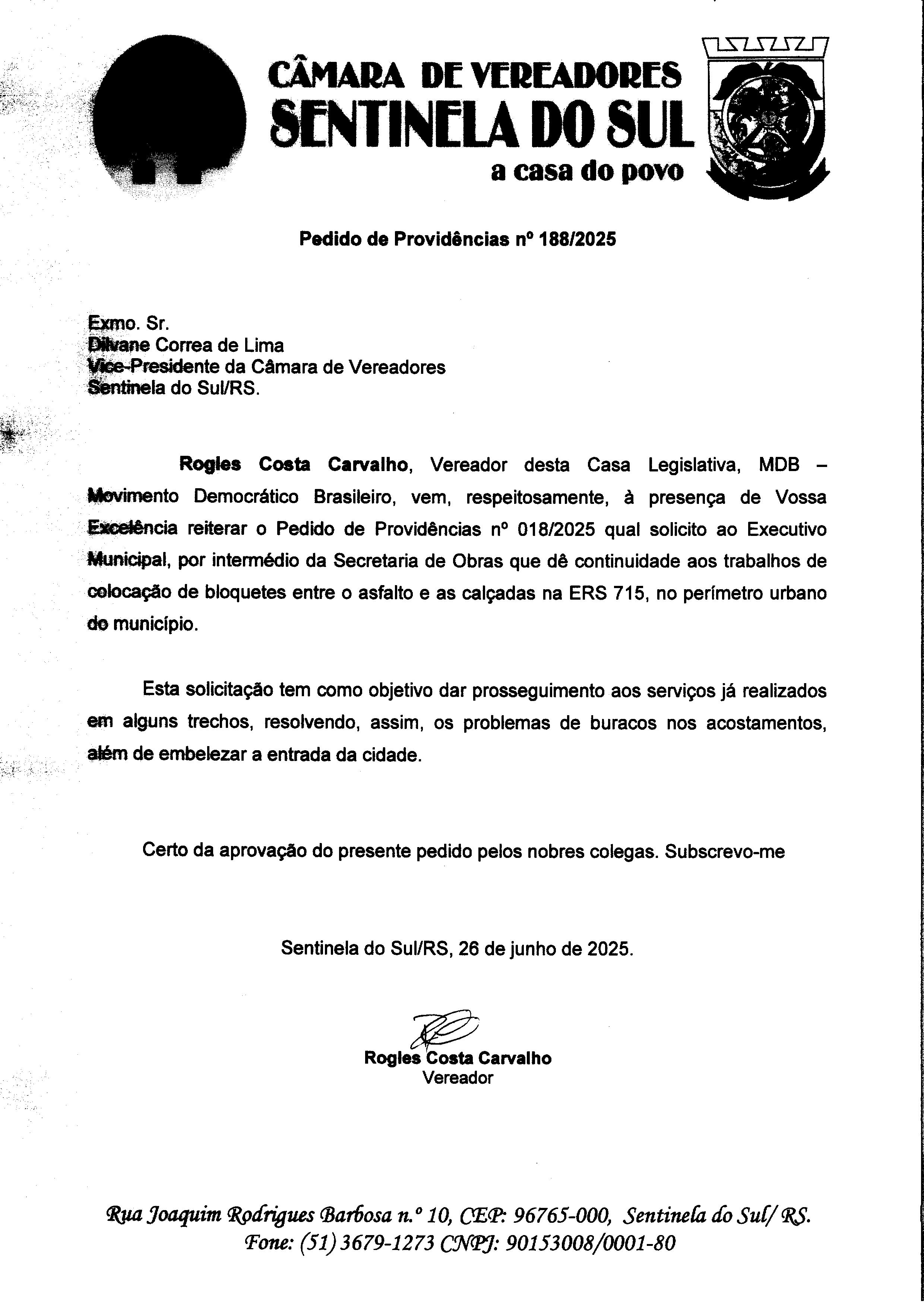 Assunto: Continuidade aos trabalhos de colocação de bloquetes entre o asfalto e as calçadas na ERS 715, no perímetro urbano do município.