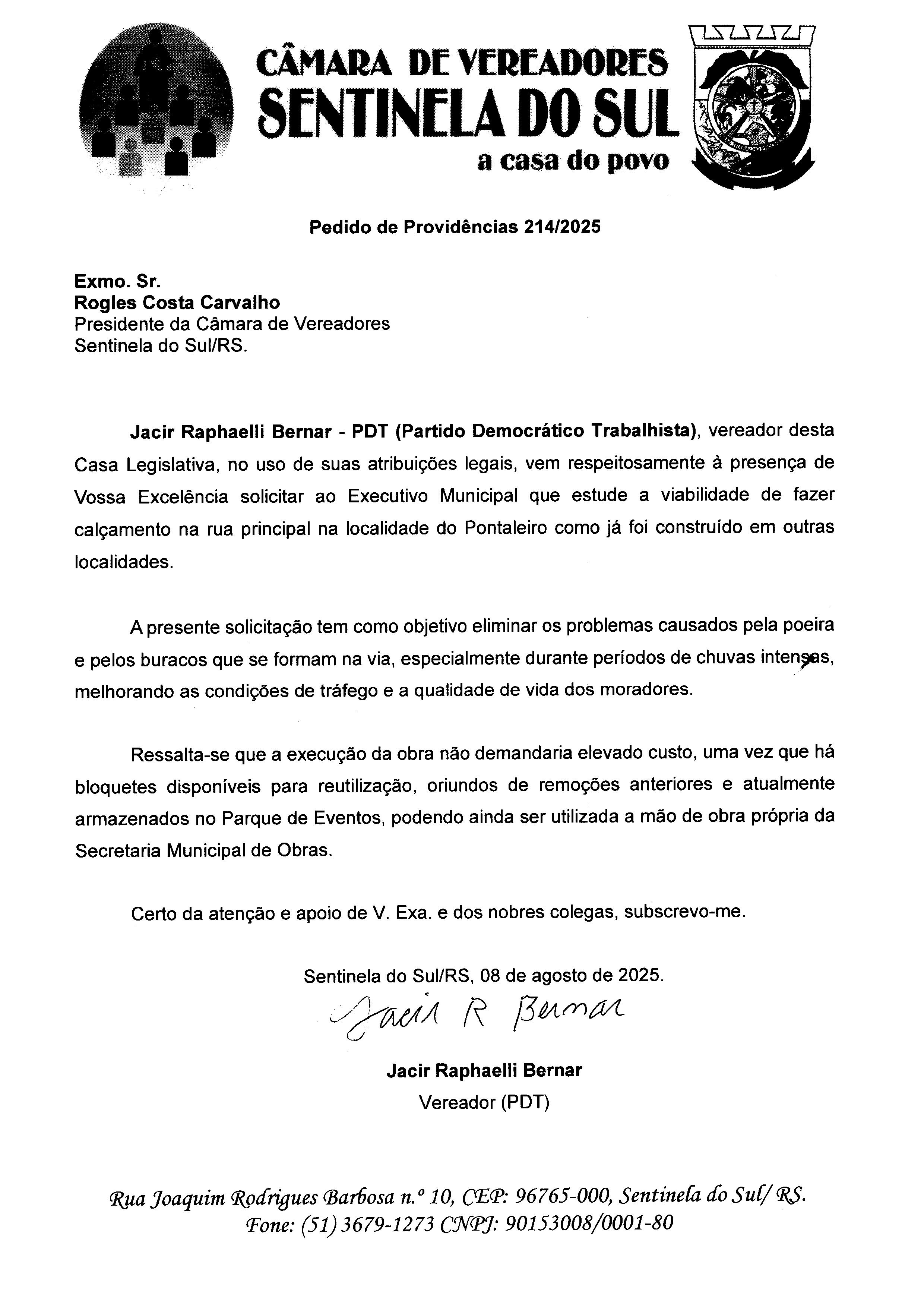 Assunto: Solicito ao Executivo Municipal que estude a viabilidade de fazer calçamento na rua principal na localidade do Pontaleiro como já foi construído em outras localidades.
