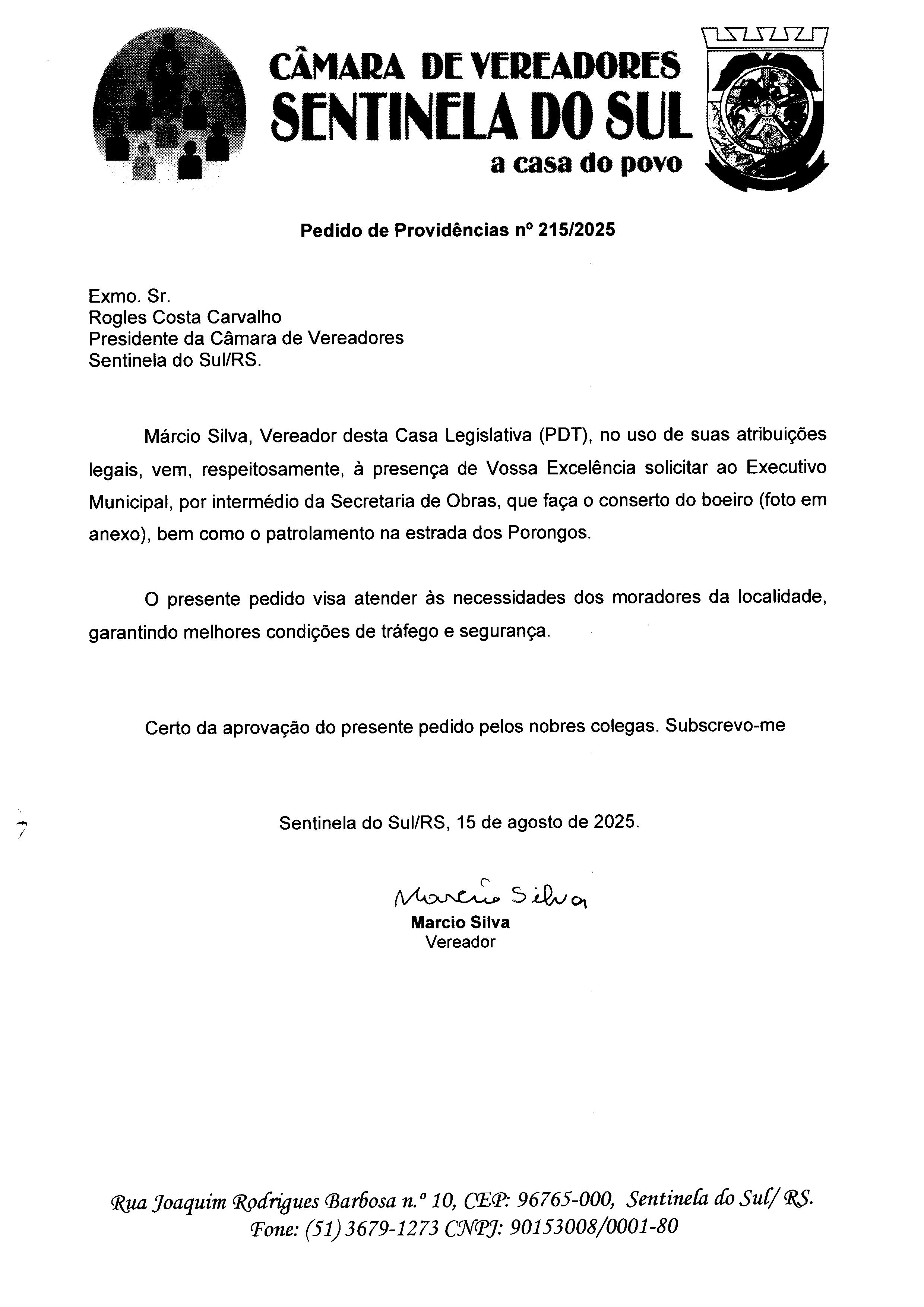 Assunto: Conserto do boeiro, bem como o patrolamento na estrada dos Porongos.