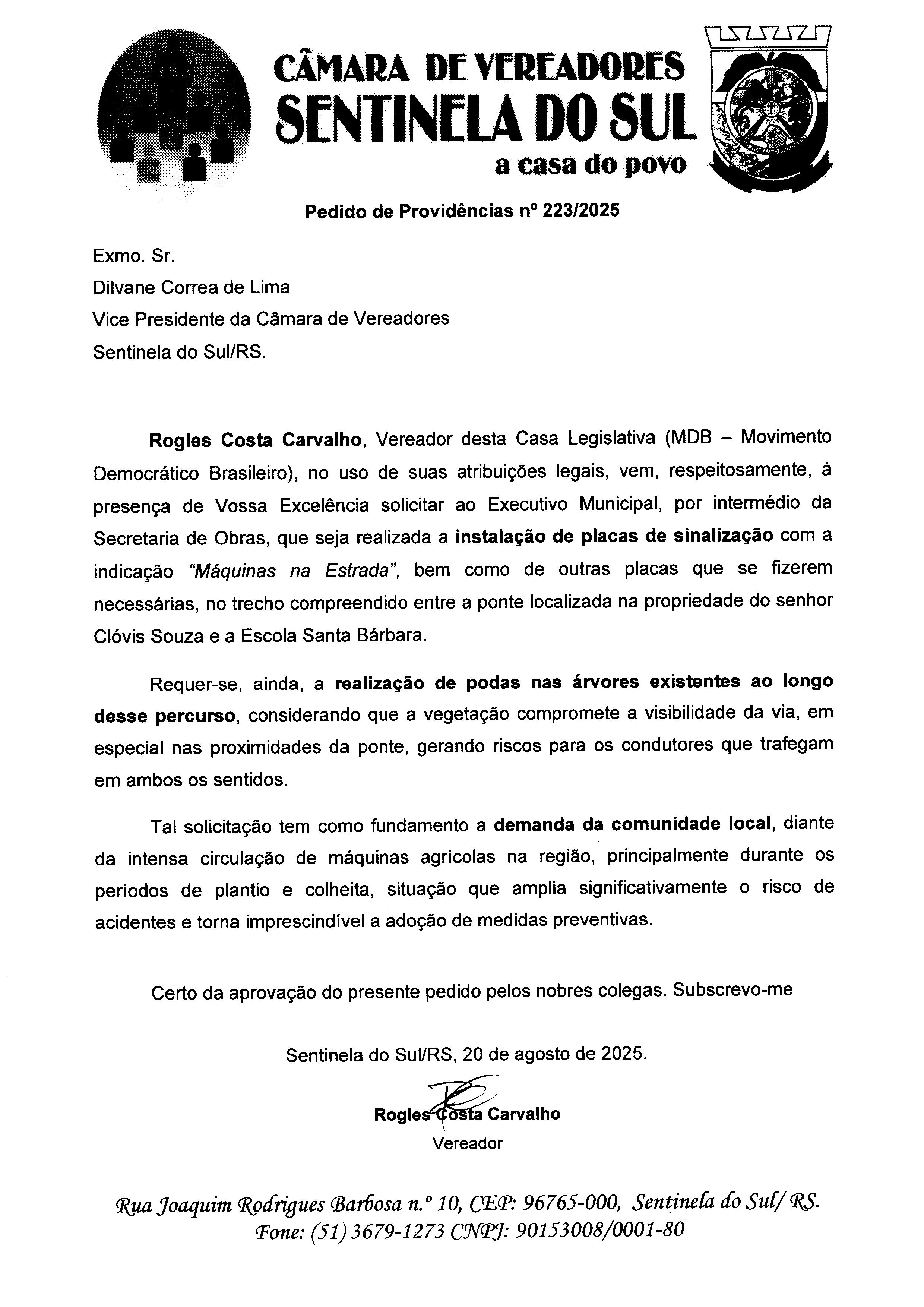 - Assunto: Instalação de placas de sinalização com a indicação “Máquinas na Estrada”, bem como de outras placas que se fizerem necessárias, no trecho compreendido entre a ponte localizada na propriedade do senhor Clóvis Souza e a Escola Santa Bárbara.