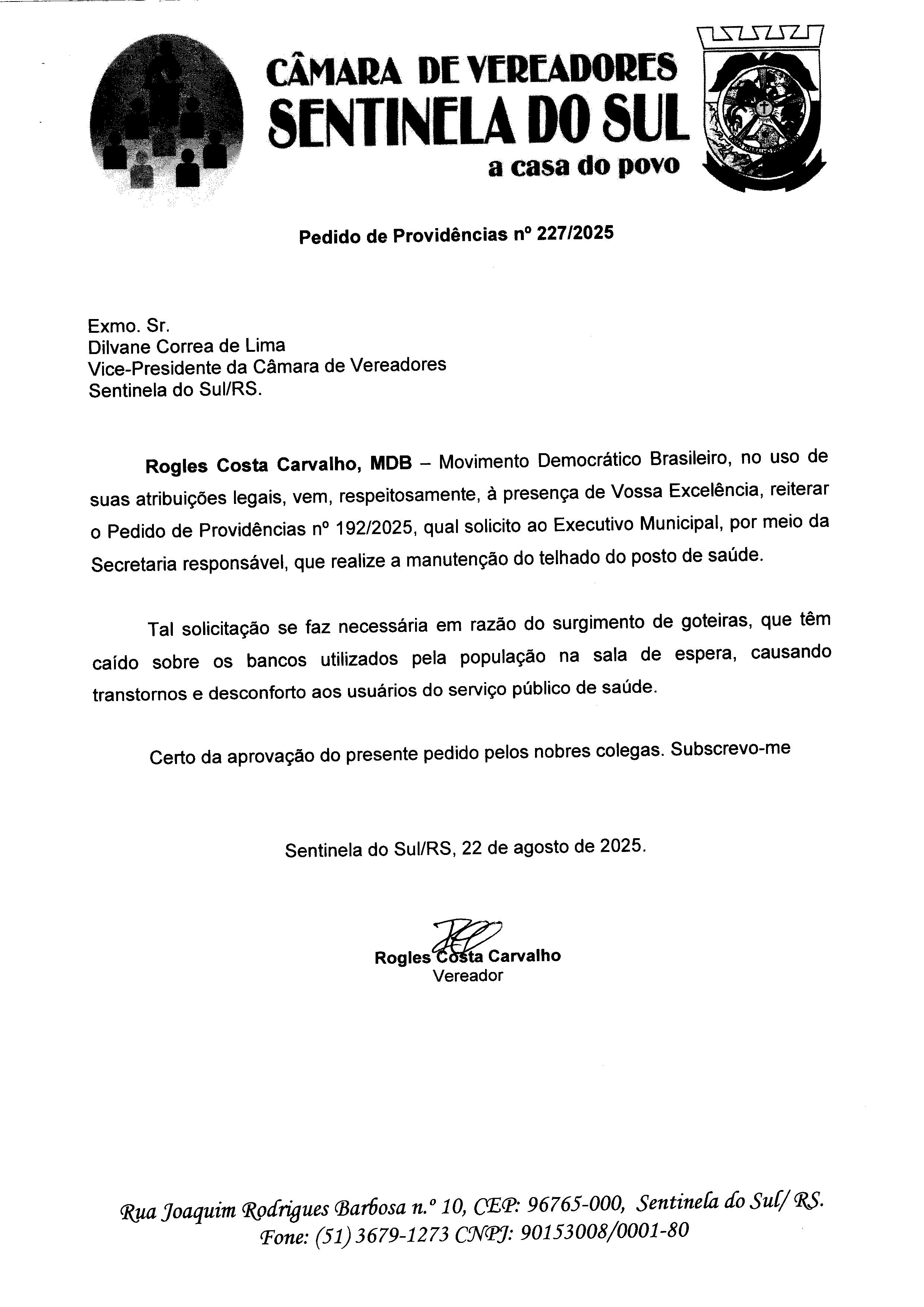 Autoria: Vereador Rogles Costa Carvalho