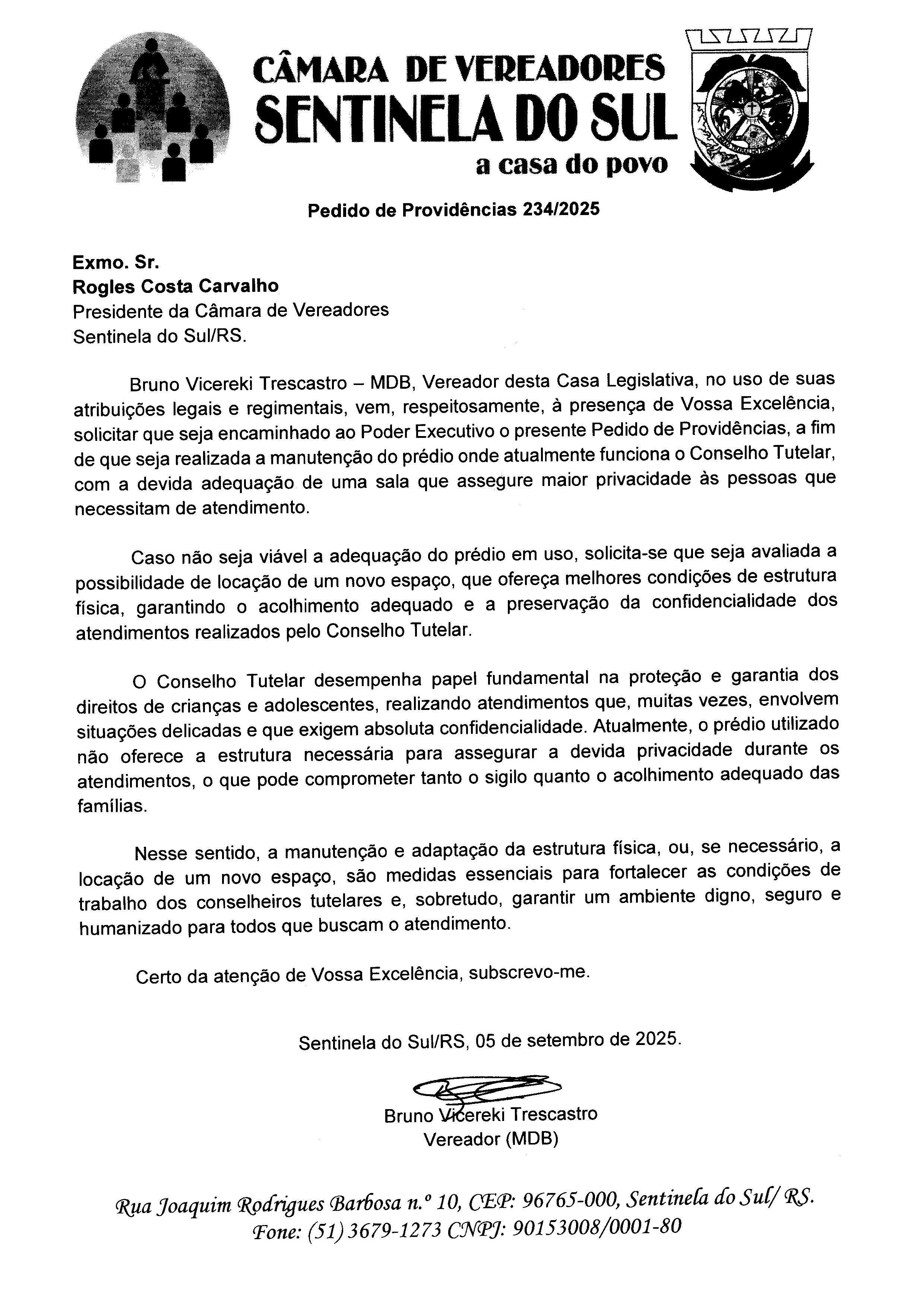 Assunto: Que seja realizada a manutenção do prédio onde atualmente funciona o Conselho Tutelar, com a devida adequação de uma sala que assegure maior privacidade às pessoas que necessitam de atendimento.