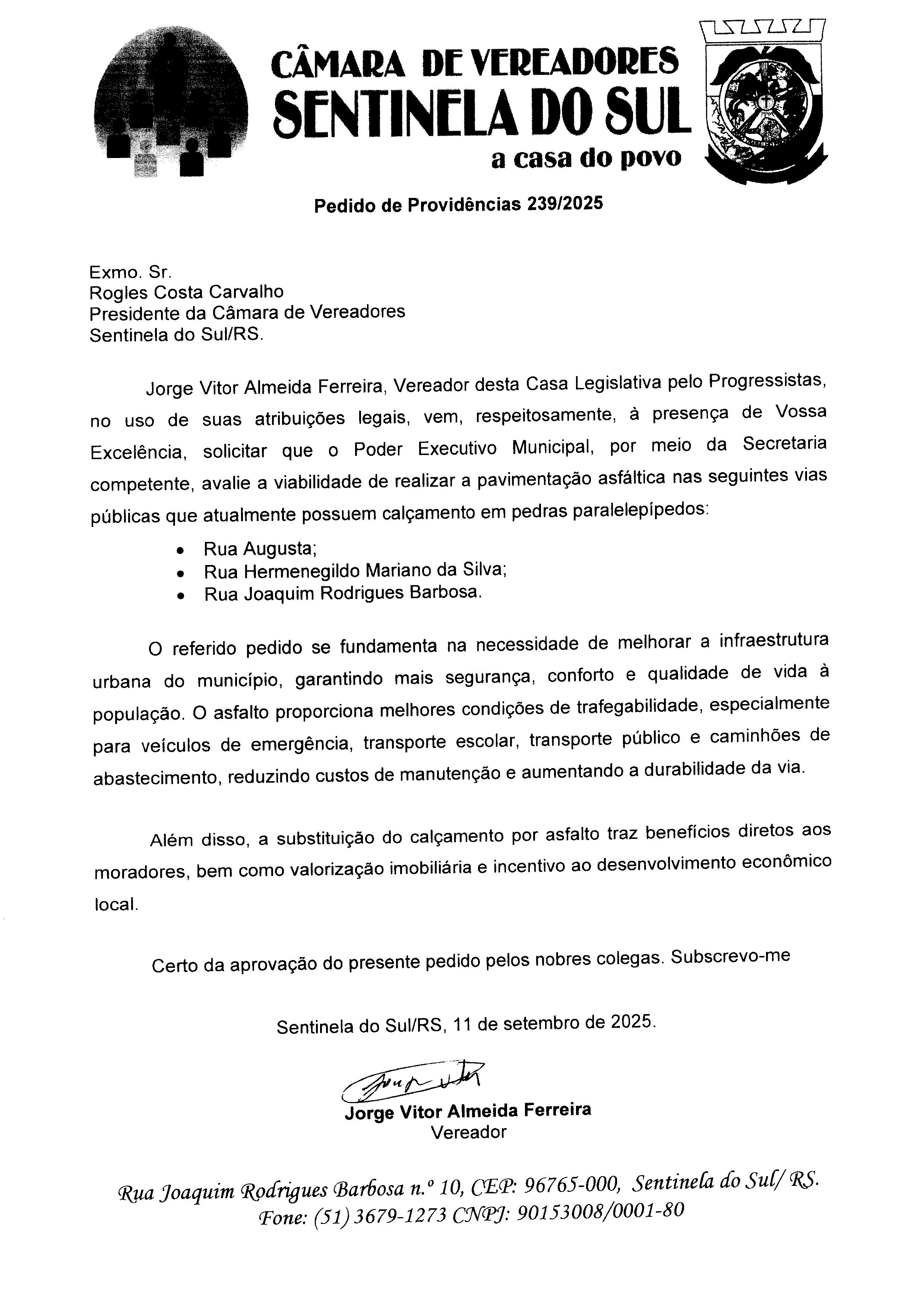 Assunto: Que o Executivo avalie a viabilidade de realizar a pavimentação asfáltica nas seguintes vias públicas que atualmente possuem calçamento em pedras paralelepípedos:
