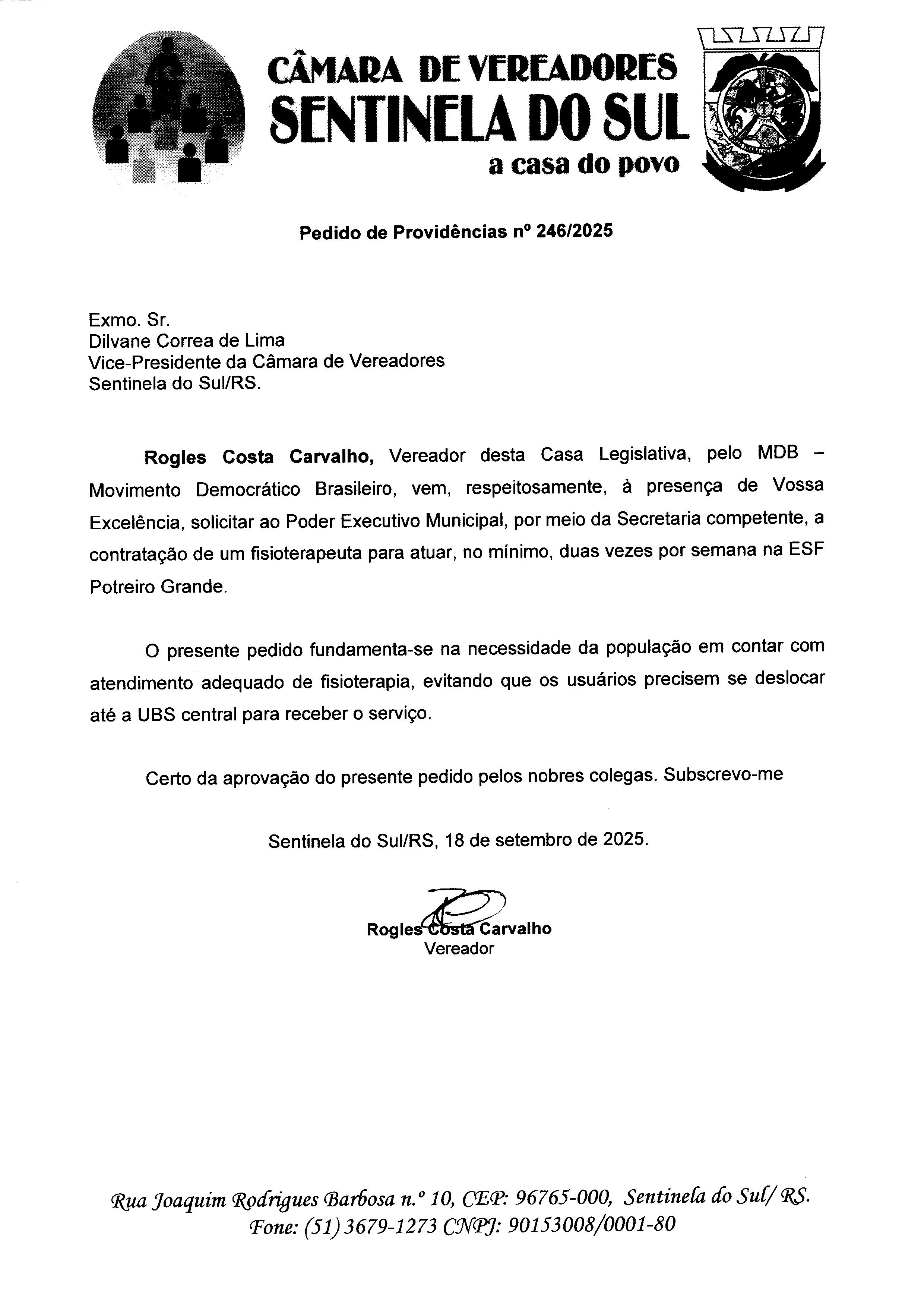 Assunto: Solicito ao Poder Executivo Municipal, por meio da Secretaria competente, a contratação de um fisioterapeuta para atuar, no mínimo, duas vezes por semana na ESF Potreiro Grande.