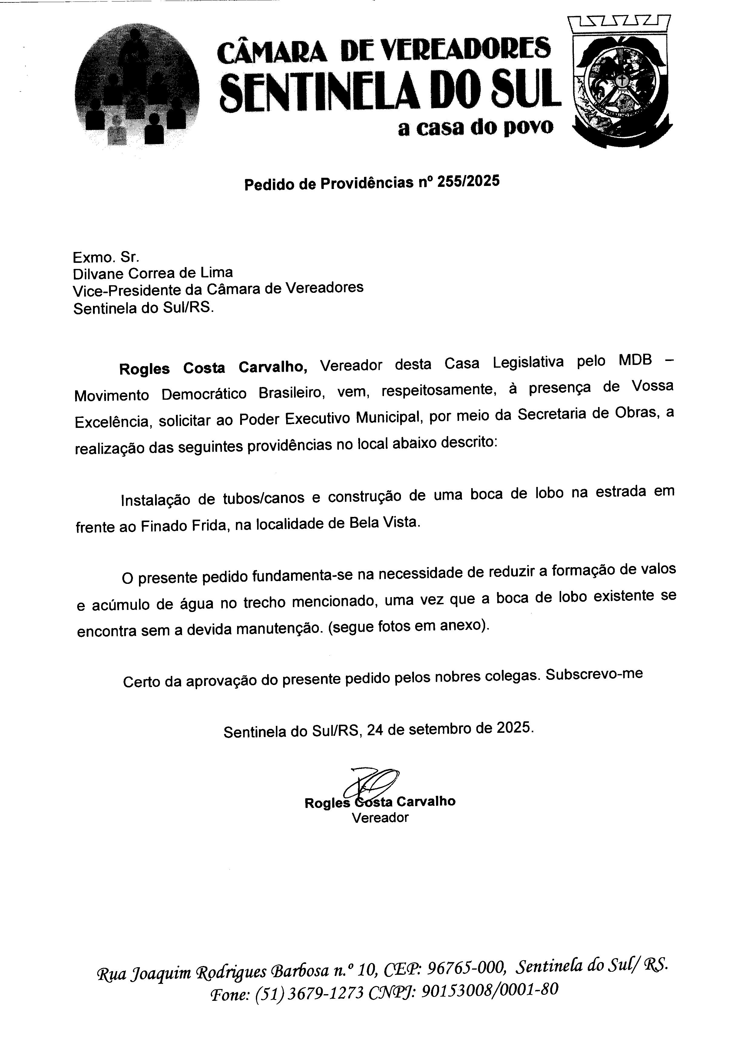 Assunto: Instalação de tubos/canos e construção de uma boca de lobo na estrada em frente ao Finado Frida, na localidade de Bela Vista.