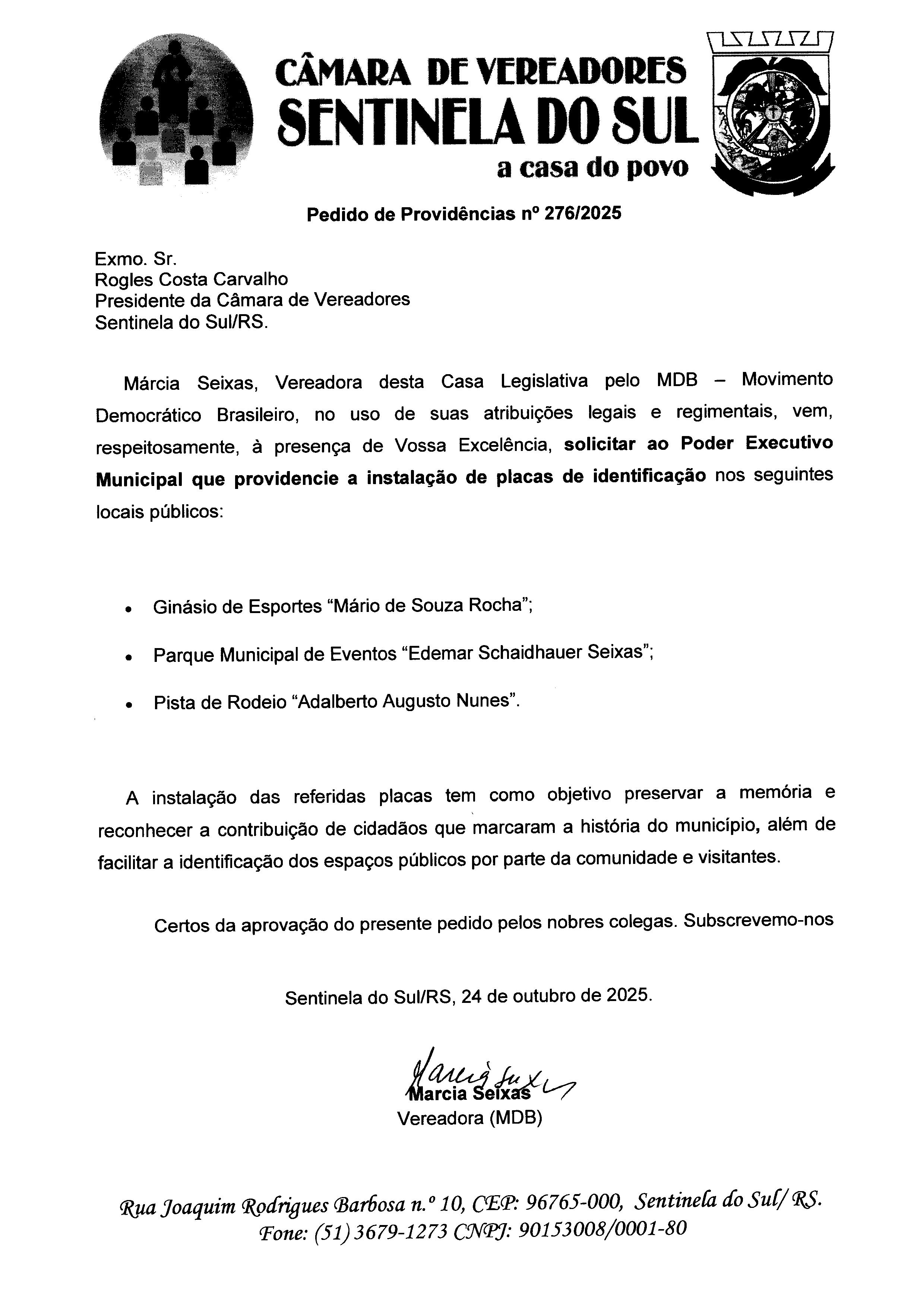 Assunto: Solicita ao Poder Executivo Municipal que providencie a instalação de placas de identificação em locais públicos