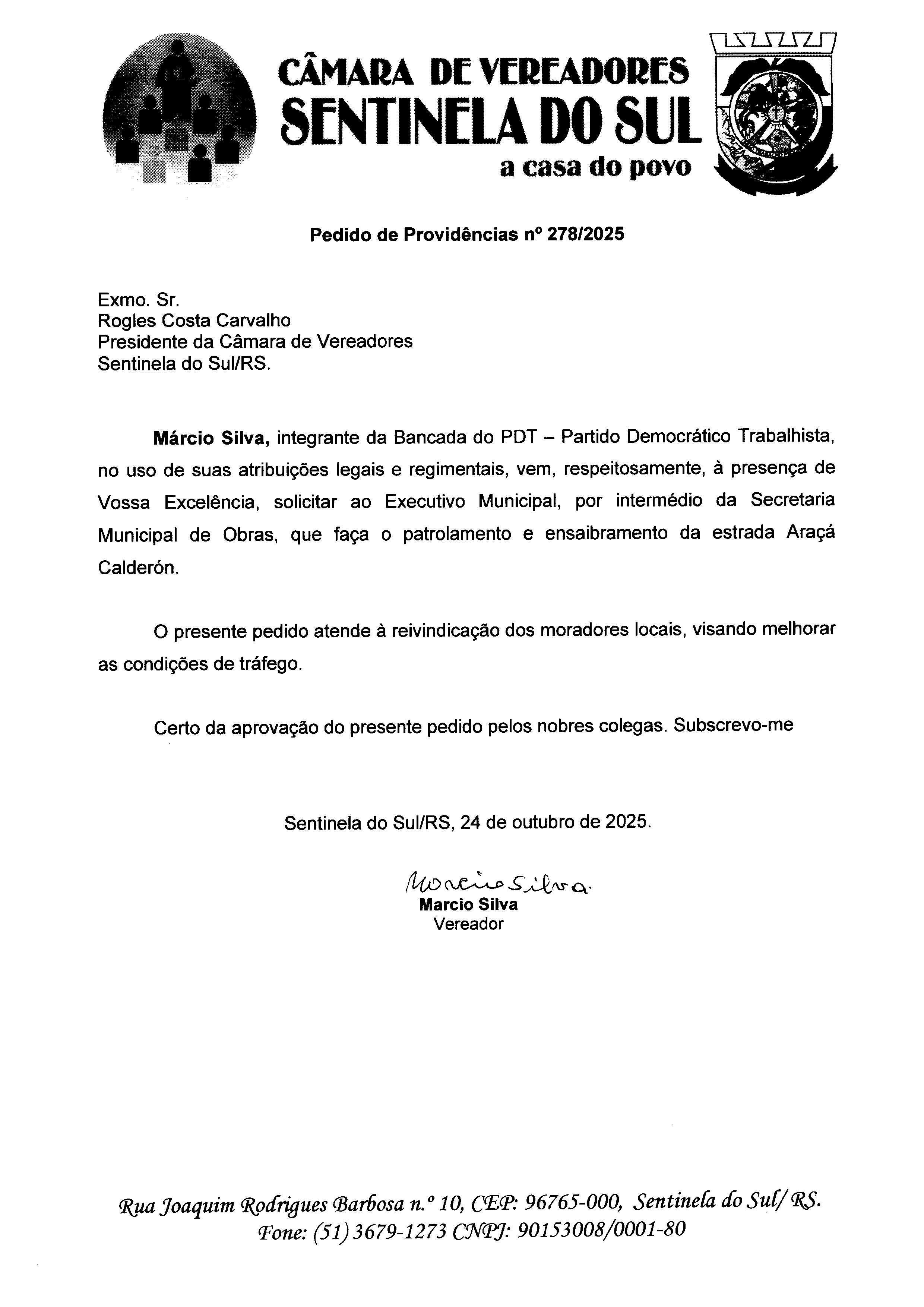 Assunto: Solicita ao Executivo Municipal, por intermédio da Secretaria Municipal de Obras, que faça o patrolamento e ensaibramento da estrada Araçá Calderón.