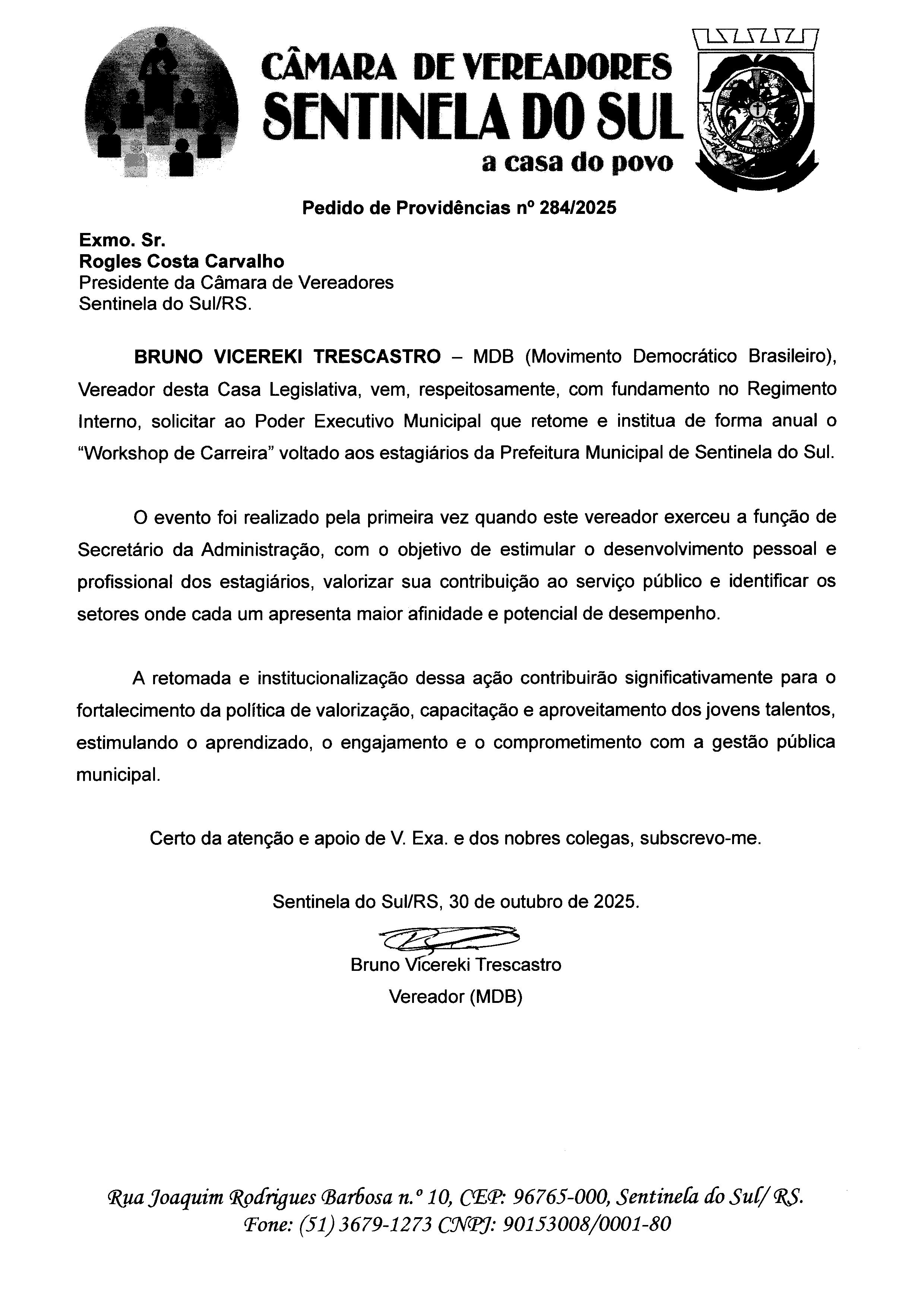 Assunto: Solicita ao Poder Executivo Municipal que retome e institua de forma anual o “Workshop de Carreira” voltado aos estagiários da Prefeitura Municipal de Sentinela do Sul.