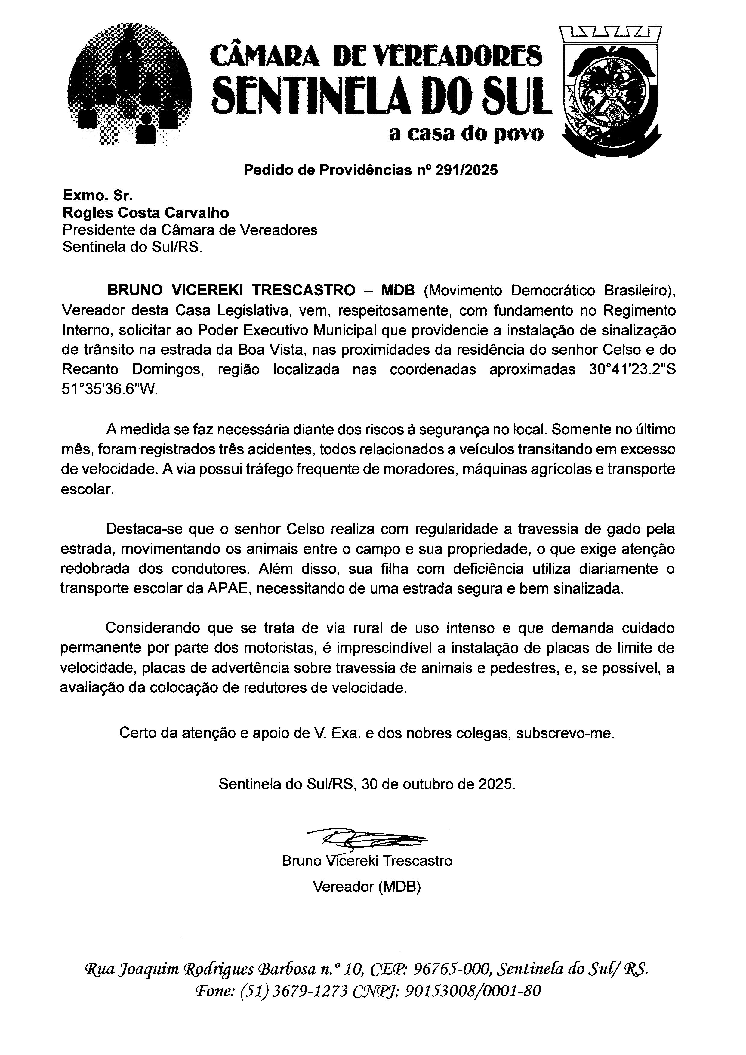 Assunto: Solicitar ao Poder Executivo Municipal que providencie a instalação de sinalização de trânsito na estrada da Boa Vista, nas proximidades da residência do senhor Celso e do Recanto Domingos.