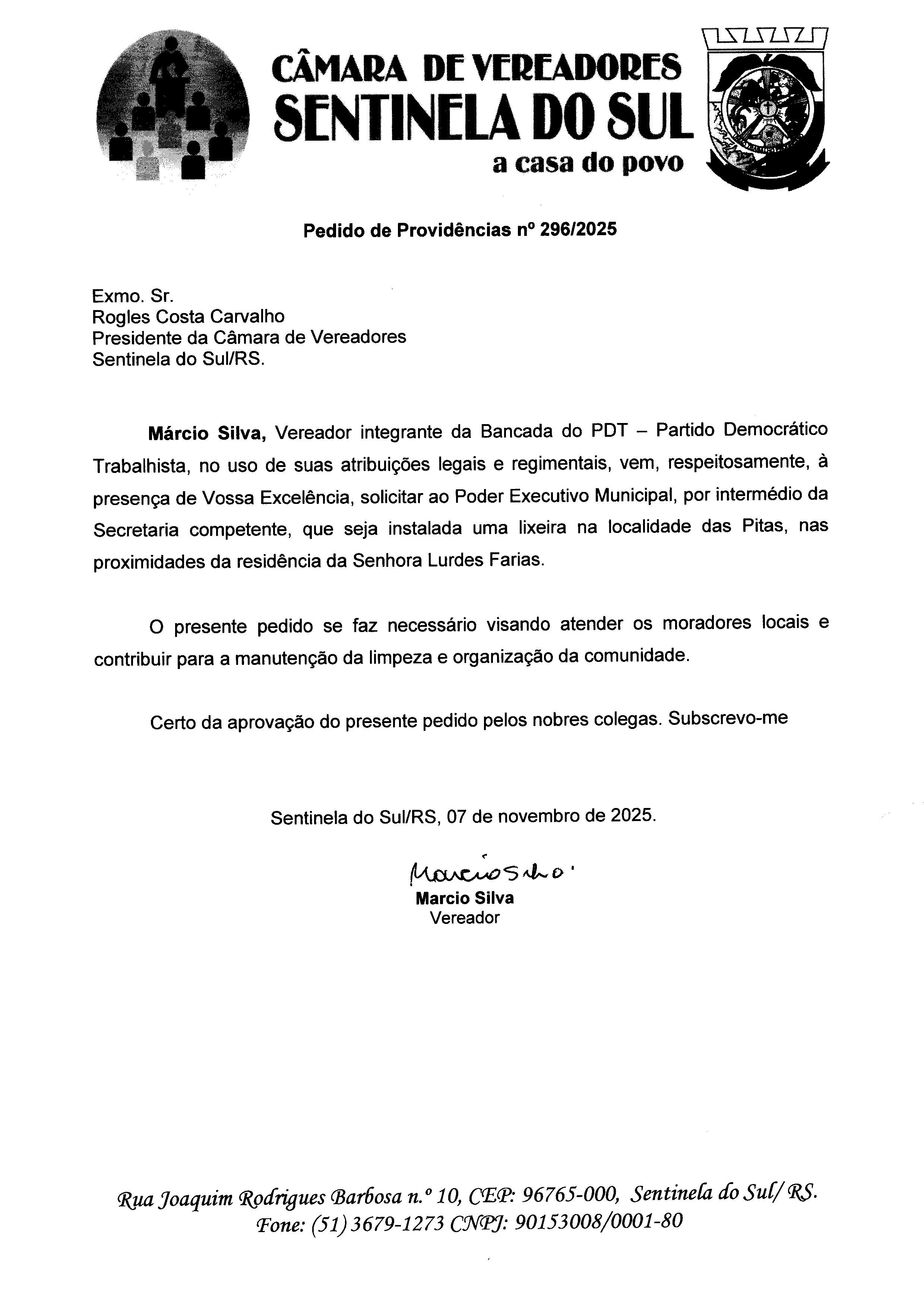 Assunto: Que seja instalada uma lixeira na localidade das Pitas, nas proximidades da residência da Senhora Lurdes Farias.