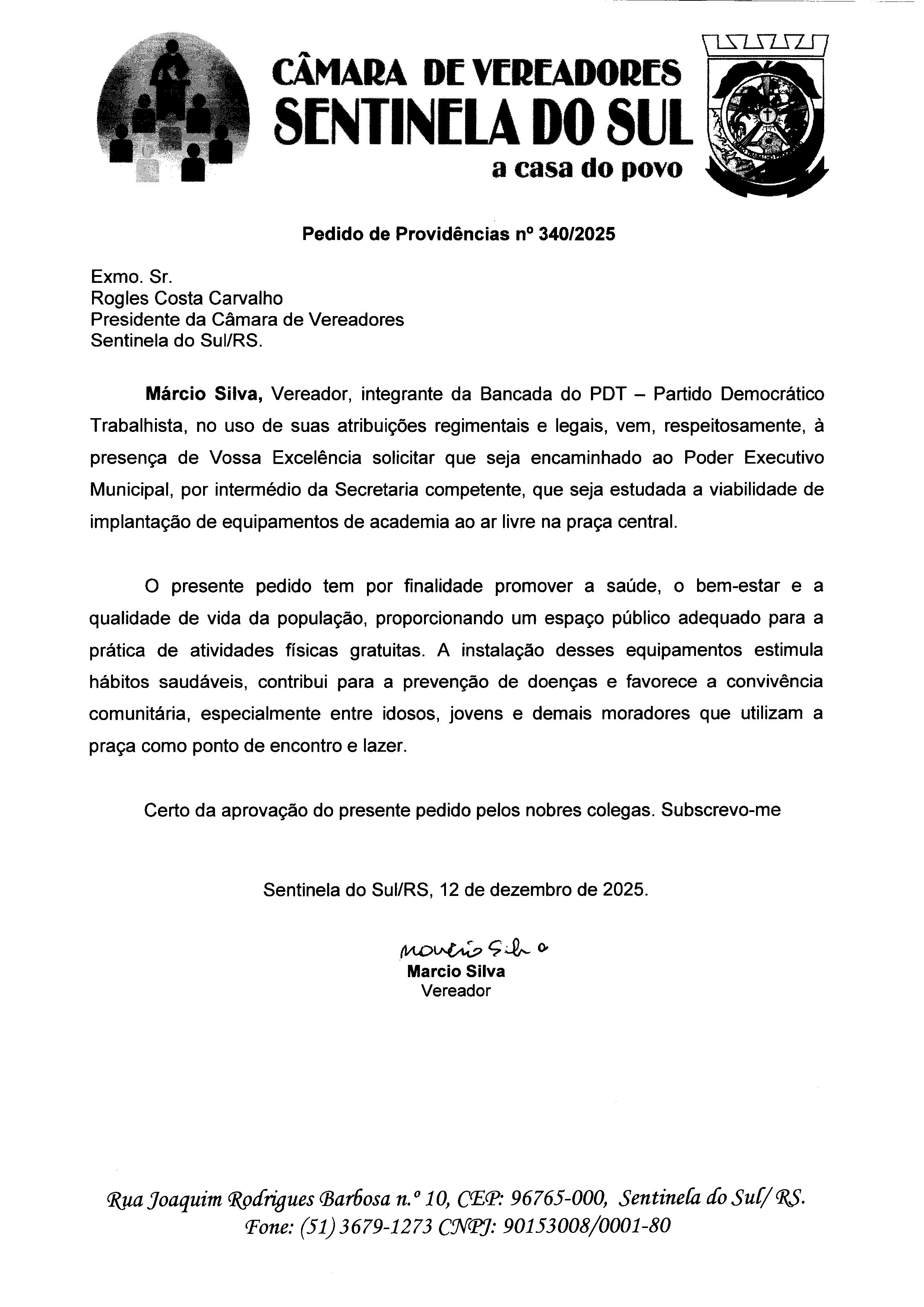 Assunto: Que seja estudada a viabilidade de implantação de equipamentos de academia ao ar livre na praça central.