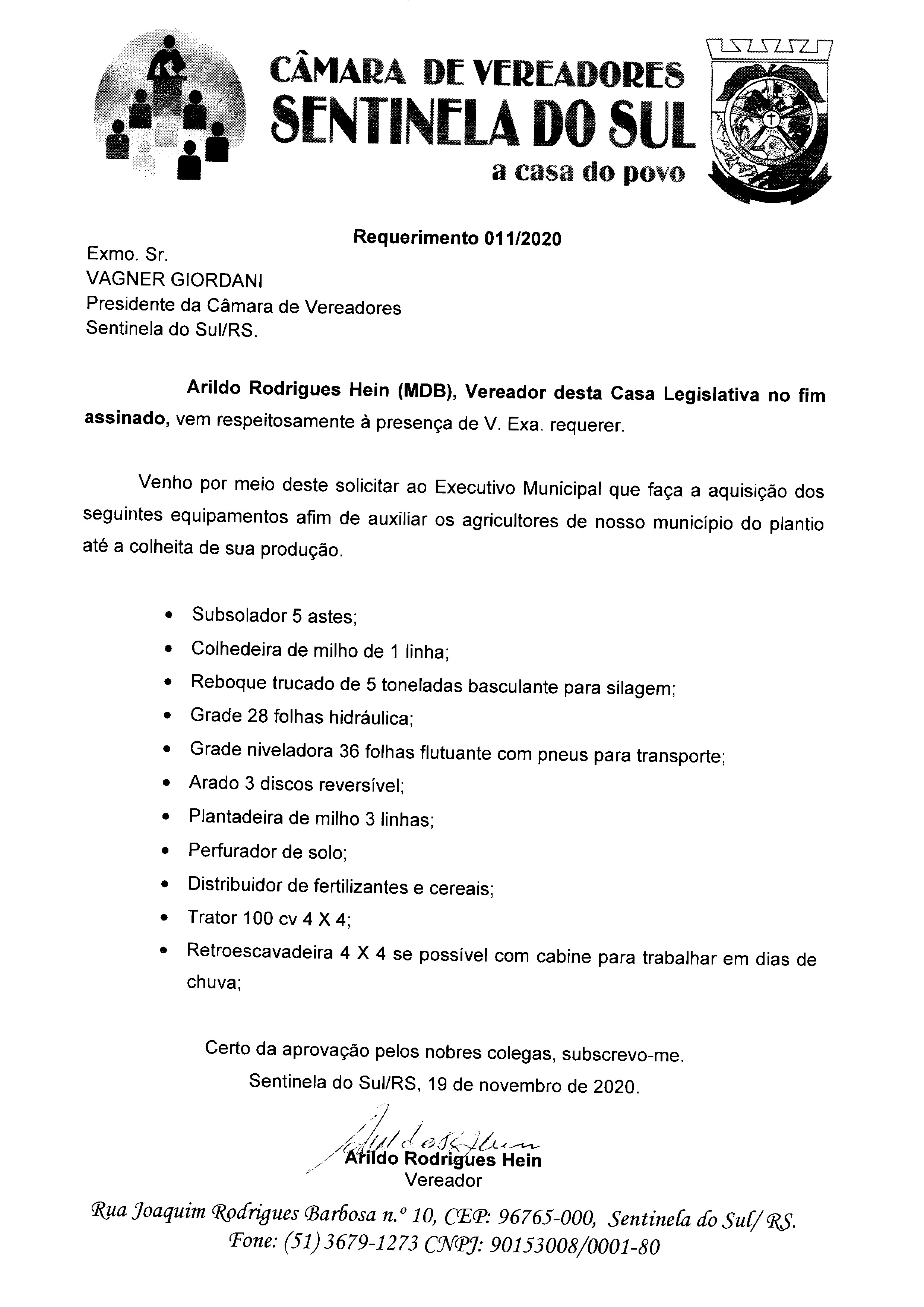 Requerimento de autoria do vereador Arildo Rodrigues Hein