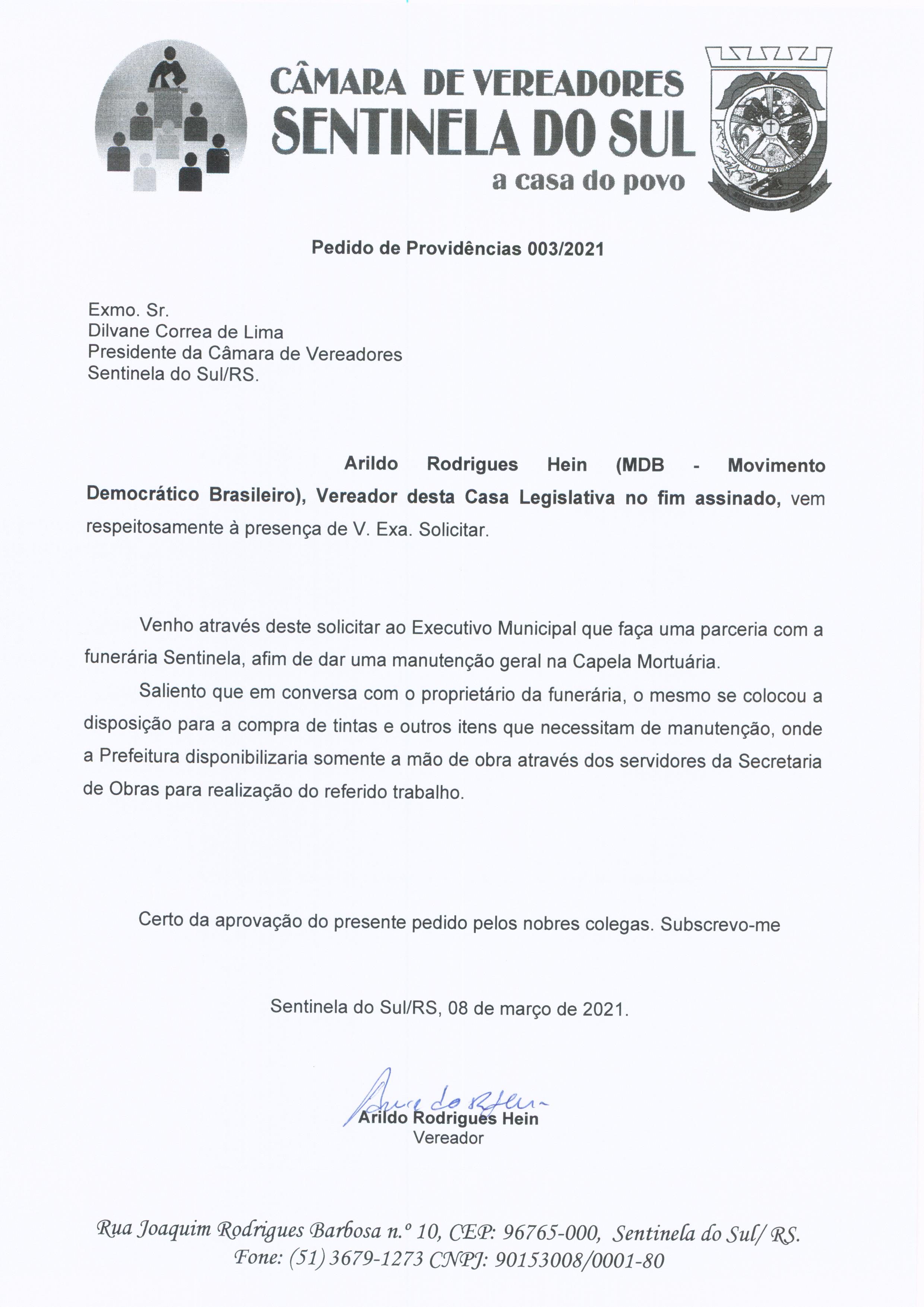 Requerimento de autoria do vereador Arildo Rodrigues Hein