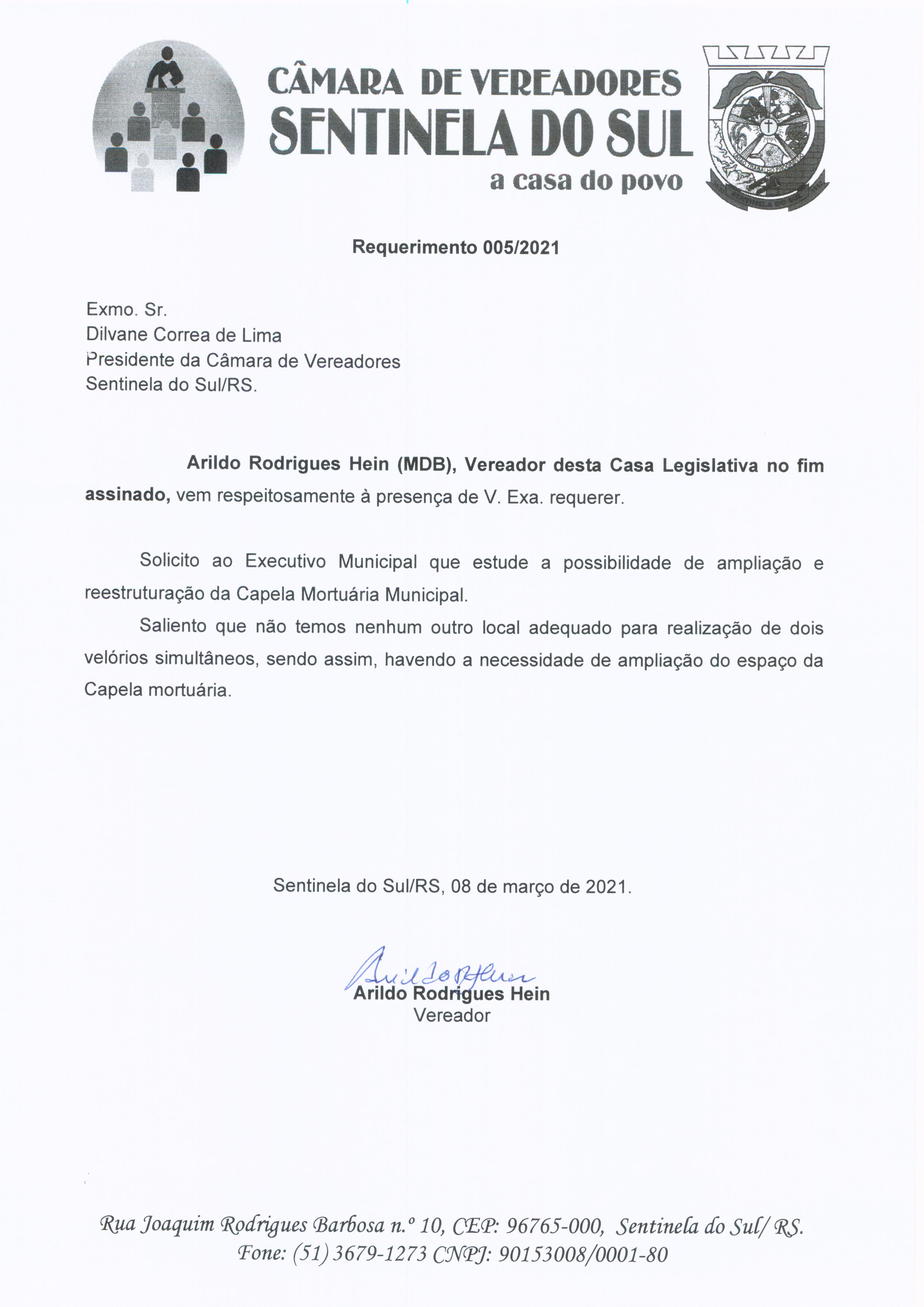 Requerimento de autoria do vereador Arildo Rodrigues Hein