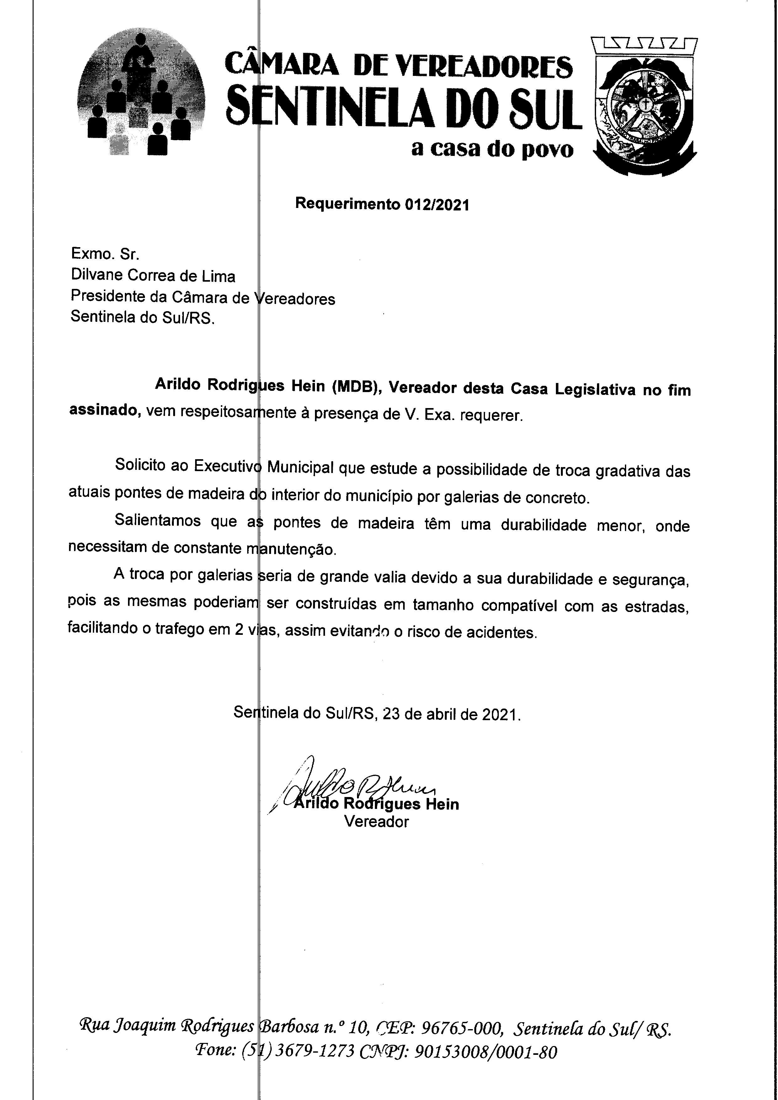 Requerimento de autoria do vereador Arildo Rodrigues Hein